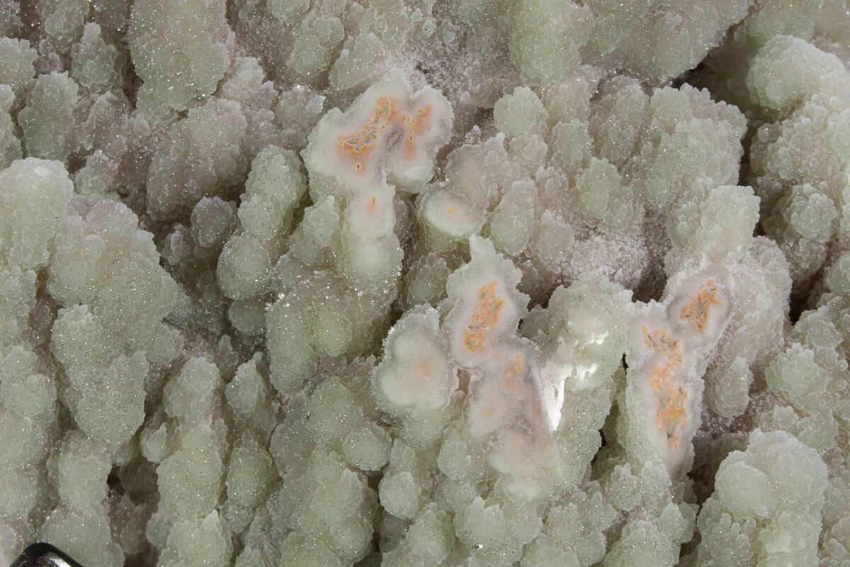 This is a gorgeous druzy quartz geode section from the famous amethyst mines near Artigas, Uruguay. In addition to the beautiful druzy formations, this specimen features a dreamy light green color that really sets this piece apart. Part of the "rind" has been polished to reveal the underlying peach-colored, fibrous mineral aggregations encrusting the basalt matrix.