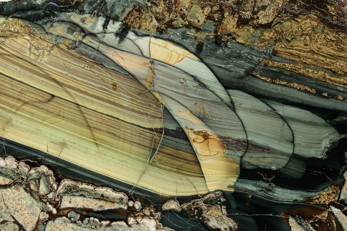 Blue Mountain picture jasper is arguably one of the most astonishing varieties of jasper across the globe. This spectacular jasper is collected in the Blue Mountains of southern Oregon. You can recognize a specimen of Blue Mountain picture jasper by its dark, blue-black core, often bordered by beige and green bands. However, its most noticeable feature is the inclusion of olive, tan, and blue orbs floating throughout. This variety is a favorite of lapidarists and is often cut into cabochons for jewelry.