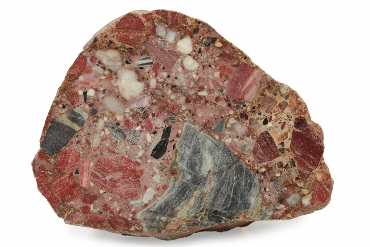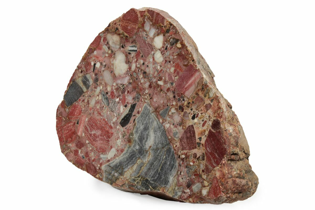 This is a large section of brecciated chert, collected from the Pinyalling Hills in the midwest region of Western Australia. One side has been cut flat and polished to a glossy finish. Chert breccia consists of innumerable angular fragments of assorted rock types. The dominant rock types associated in the mix are agate, jasper, chert, and hematite, and originates from a type of jasper that goes by the trade name Pinyalling jasper.