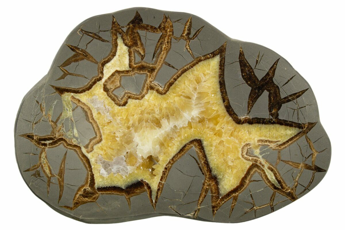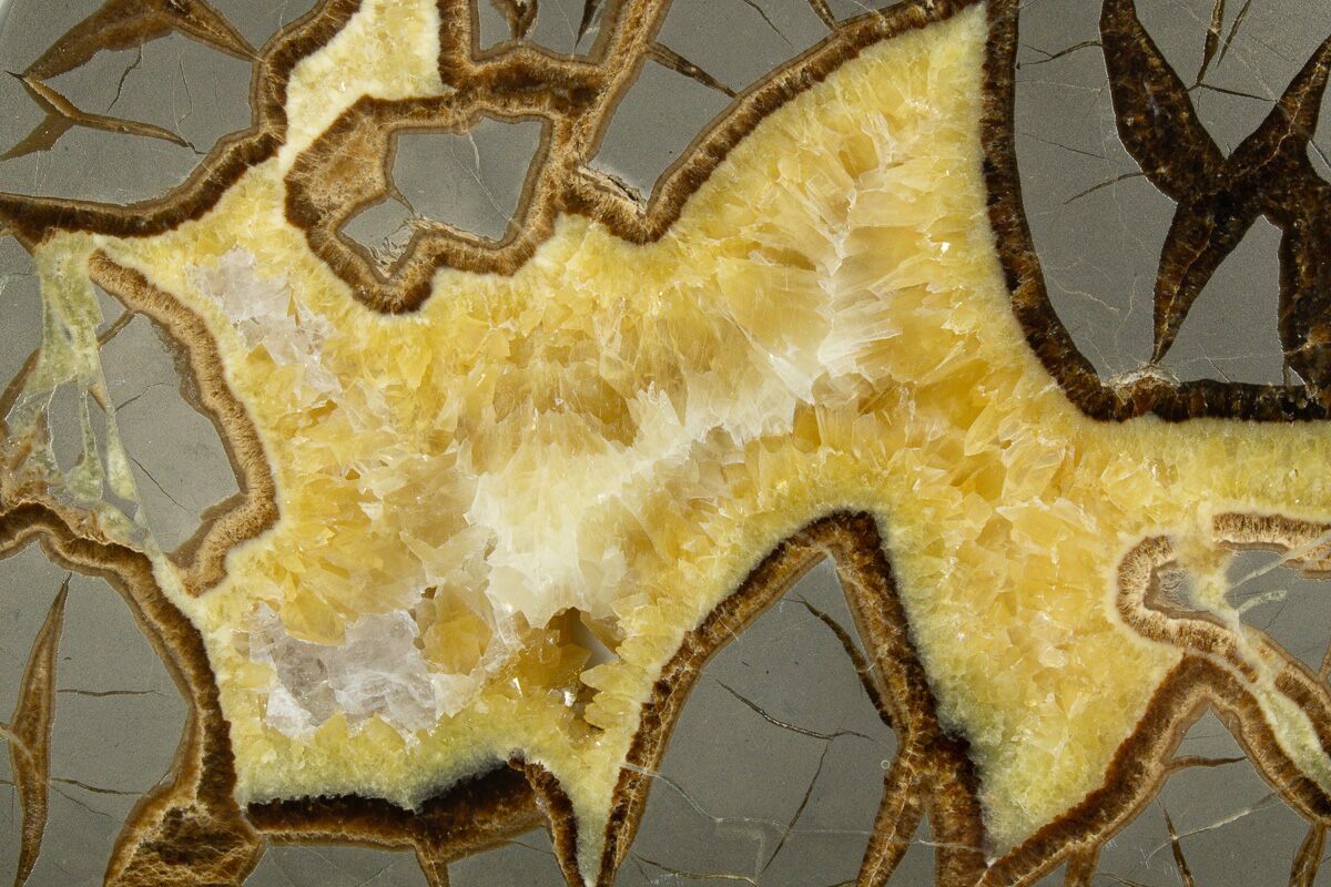 This is a beautiful polished slice from a septarian nodule. This septarian was mined West of Orderville, Utah and was deposited during the Late Cretaceous, about 100 million years ago. The contrast between the grey limestone, yellow calcite crystals, and brown aragonite is quite stunning. It has been polished on one side and displays well on the included display stand.