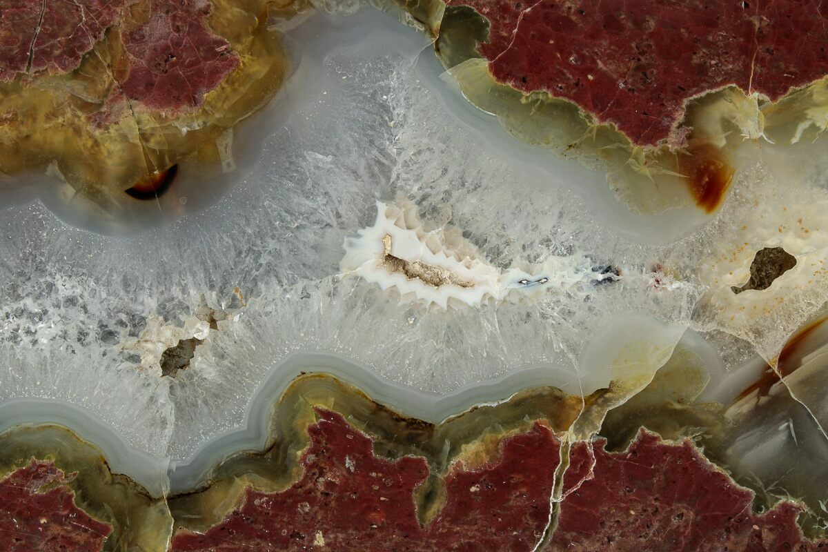 Agate is a variety of microcrystalline quartz (chalcedony) that displays translucence and, in some cases, banding. Agate primarily forms when silica-rich fluids fill pockets within rocks and/or fossils, depositing the silica along the walls of the rock. This process can result in banding patterns, as the compositions and impurities of these depositing fluids change over time. These banding patterns can either form as flat layers, creating linear patterns known as waterline agate, or as rounded layers, forming more common ring-like patterns. These patterns depend on the surfaces available for deposition.