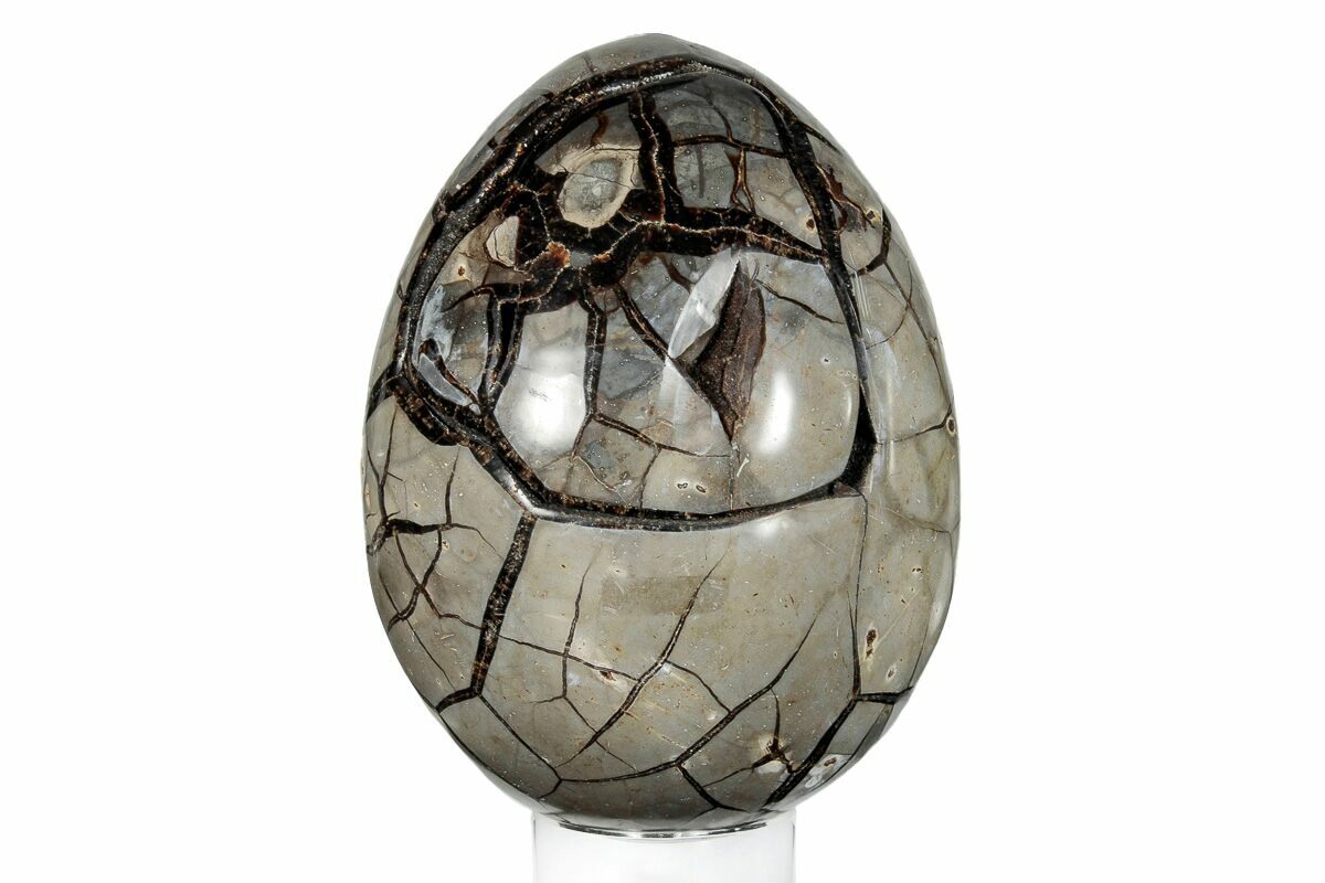 This is a polished septarian geode collected from the Betsiboka Region of Madagascar. The hollow cavity is full of shimmering black calcite crystals, and the exterior has been shaped and polished into an egg with a glossy finish. A removable "puzzle piece" allows the interior crystal filled cavity to be viewed.