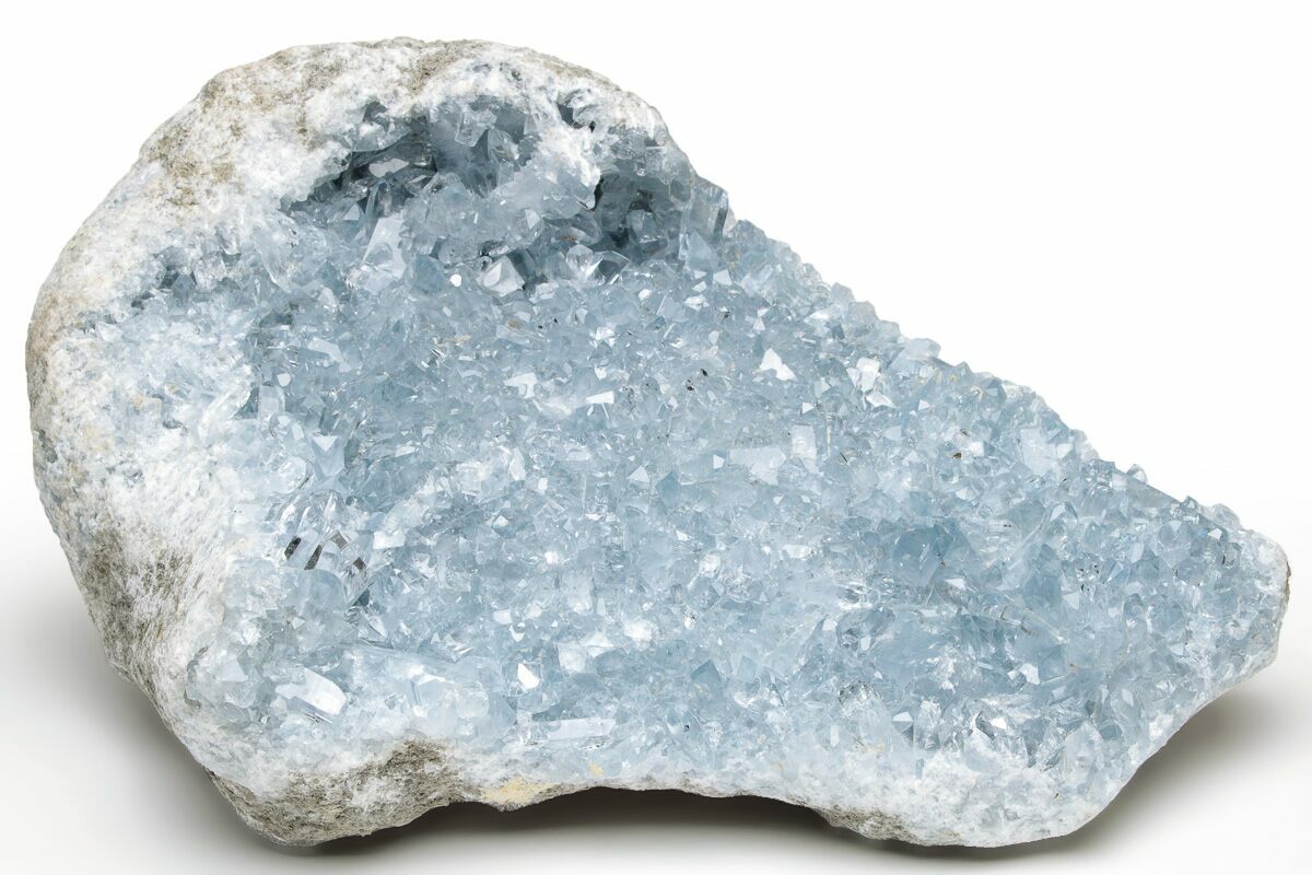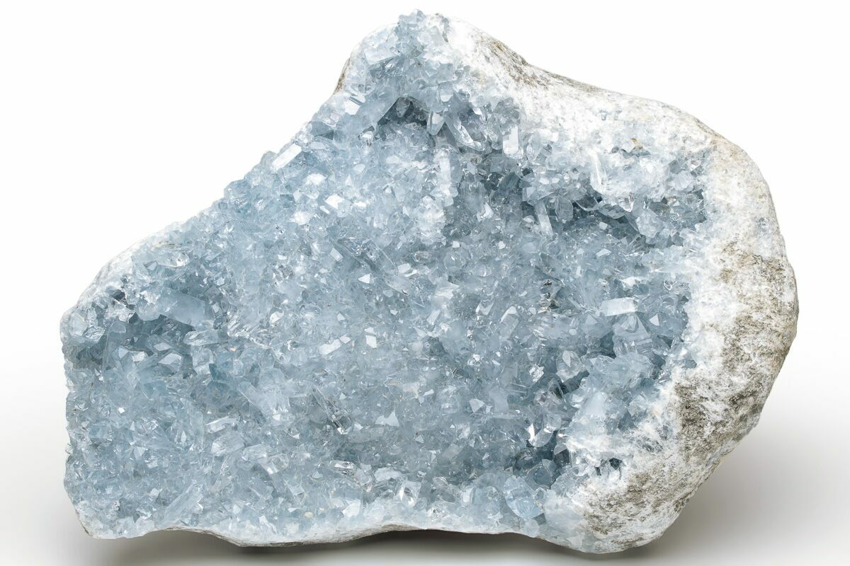 Celestite (or celestine) is a mineral consisting of strontium sulfate (SrSO4). It tends to form attractive, well-shaped crystals that are often found inside of geodes. One of the main sources of celestine is the deposits on the northwestern coast of Madagascar.