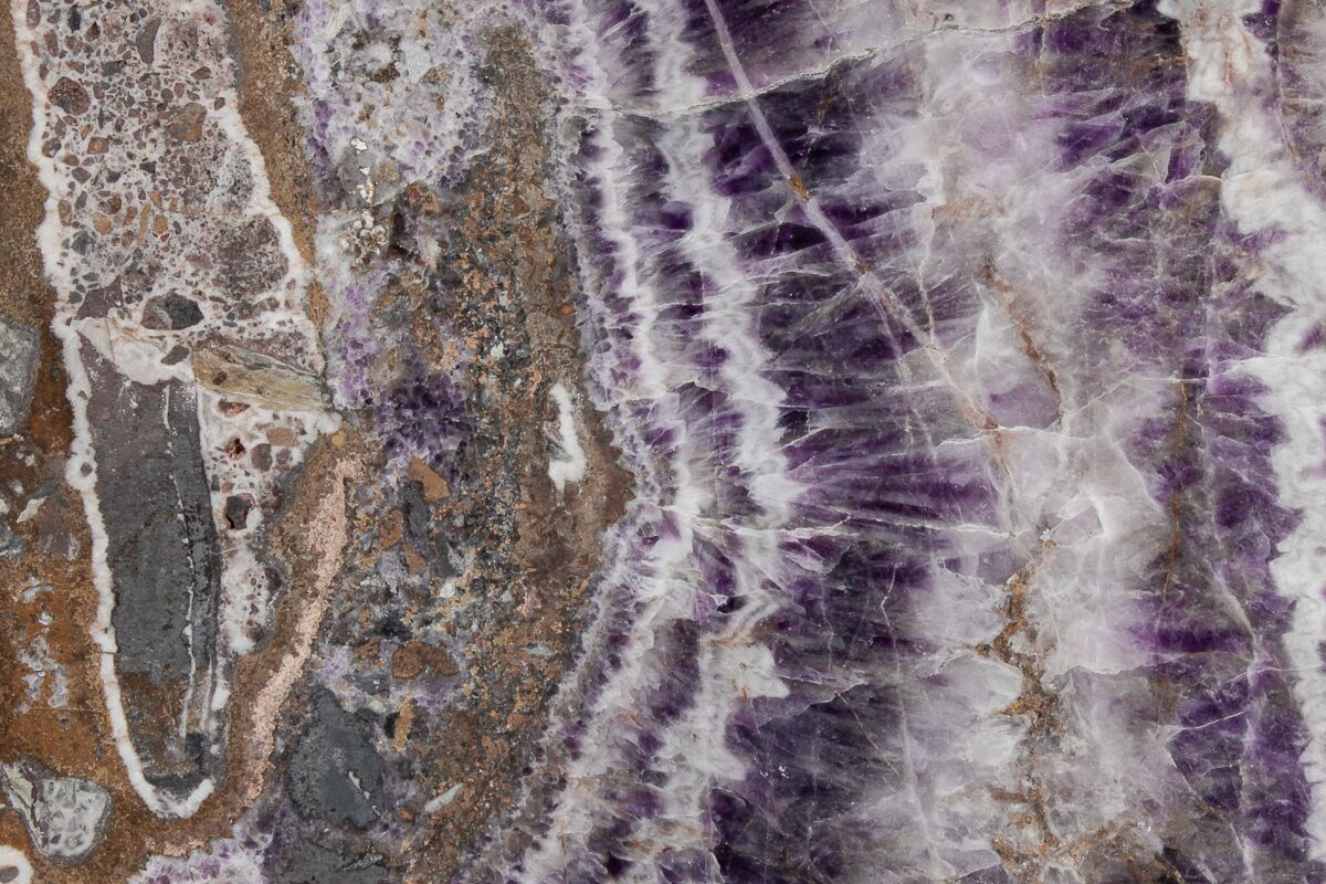 Chevron amethyst is a naturally banded variety of amethyst characterized by striking V-shaped or zigzag patterns formed by alternating layers of purple amethyst and white quartz. These distinctive chevrons develop as quartz crystals grow in pulses under changing geological conditions, recording subtle variations in chemistry and temperature during formation. Amethyst itself is the purple variety of quartz, colored by trace amounts of iron and natural irradiation during crystal growth, and has been prized for centuries as both a gemstone and a collector mineral. In chevron amethyst, the interplay between translucent white quartz and richly colored amethyst creates a dramatic visual contrast that highlights the mineral’s internal structure and growth history, making it especially popular for polished stones, points, and decorative specimens.
