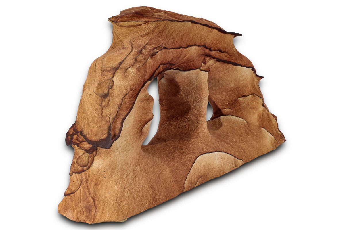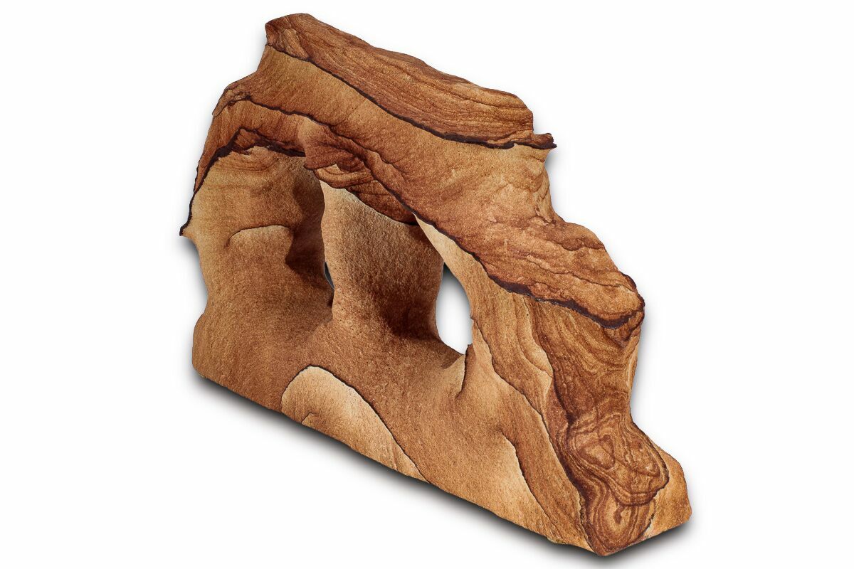 This is a 9.5" wide Toroweap picture sandstone arch. This stunning and distinctive sandstone, mined near Snowflake, Arizona, has been artistically crafted into an arch shape, inspired by natural sandstone formations like Delicate Arch in Arches National Park. The base of this specimen has been cut flat easy display.