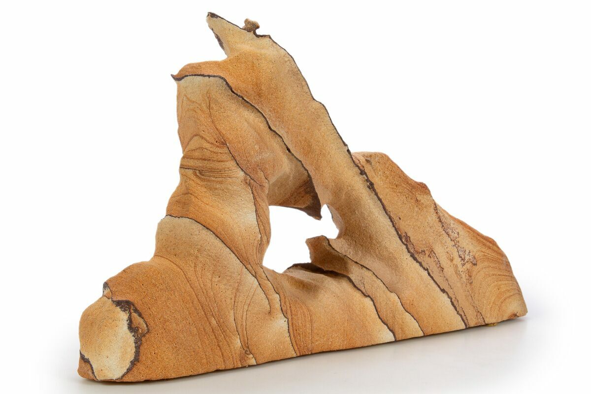 This is a 9.5" wide Toroweap picture sandstone arch. This stunning and distinctive sandstone, mined near Snowflake, Arizona, has been artistically crafted into an arch shape, inspired by natural sandstone formations like Delicate Arch in Arches National Park. The base of this specimen has been cut flat for vertical presentation.