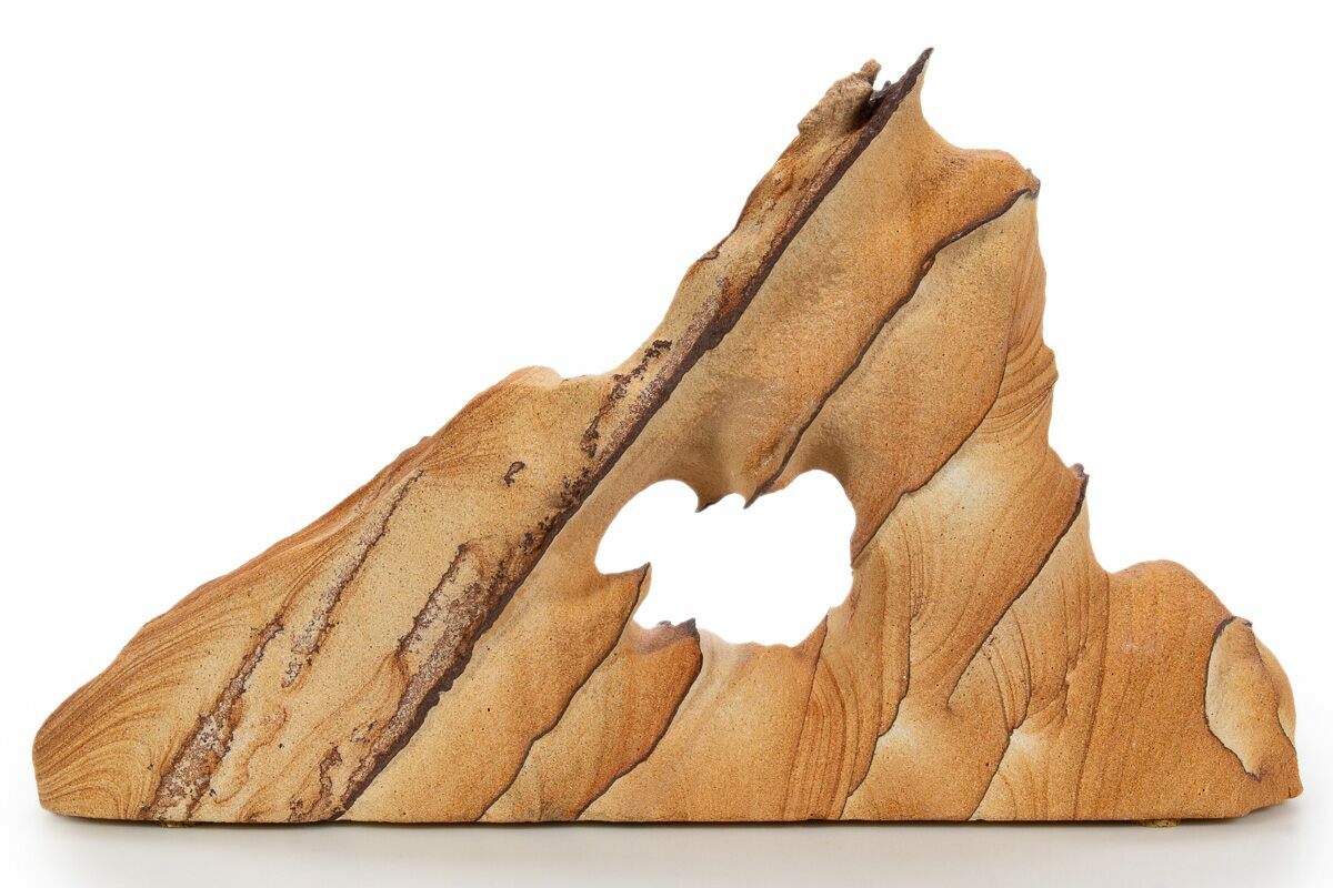 The stone's striking banding and patterns are entirely natural, formed by the infiltration of iron oxide-rich groundwater over millennia. These vibrant colors can become even more pronounced through exposure to intense heat. This effect was first discovered when a geologist noticed a piece of sandstone with brighter-than-usual coloring buried in the dirt. Further investigation revealed that the rock’s vivid hues resulted from chemical alterations caused by exposure to extreme heat, likely from a forest fire. Inspired by this discovery, the geologist experimented with "baking" the stone in an oven at 500°F for several hours, successfully replicating the effect.