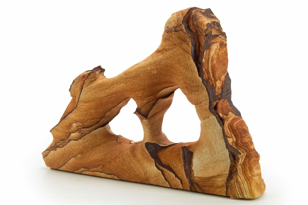 The stone's striking banding and patterns are entirely natural, formed by the infiltration of iron oxide-rich groundwater over millennia. These vibrant colors can become even more pronounced through exposure to intense heat. This effect was first discovered when a geologist noticed a piece of sandstone with brighter-than-usual coloring buried in the dirt. Further investigation revealed that the rock’s vivid hues resulted from chemical alterations caused by exposure to extreme heat, likely from a forest fire. Inspired by this discovery, the geologist experimented with "baking" the stone in an oven at 500°F for several hours, successfully replicating the effect.
