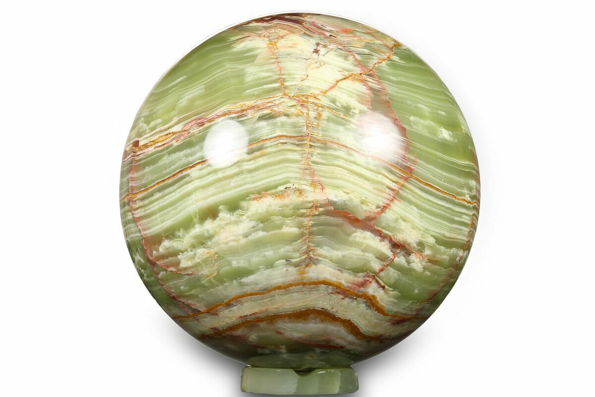 This is a beautiful polished sphere carved from a kind of calcite known as Pakistan green onyx. The stone varies from pale to deep olive green and has white and red banding throughout. It measures 9.7" in diameter and comes with a matching display stand.