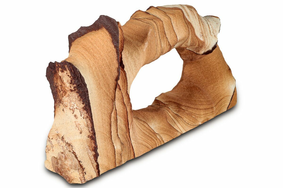 This is a 9.7" wide Toroweap picture sandstone arch. This stunning and distinctive sandstone, mined near Snowflake, Arizona, has been artistically crafted into an arch shape, inspired by natural sandstone formations like Delicate Arch in Arches National Park. The base of this specimen has been cut flat for vertical presentation.