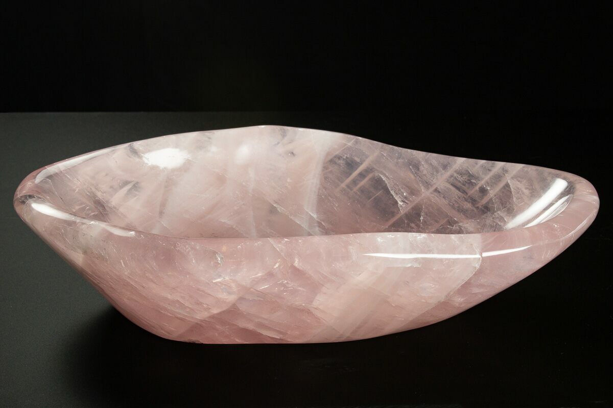 This is a gorgeous, 9.8" wide, polished rose quartz bowl/dish. It has been hand carved/polished out of a solid piece of rose quartz crystal.
