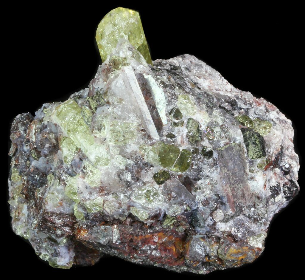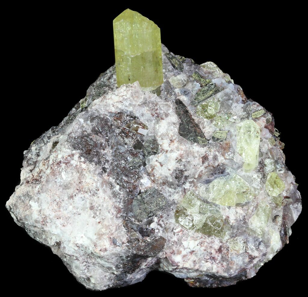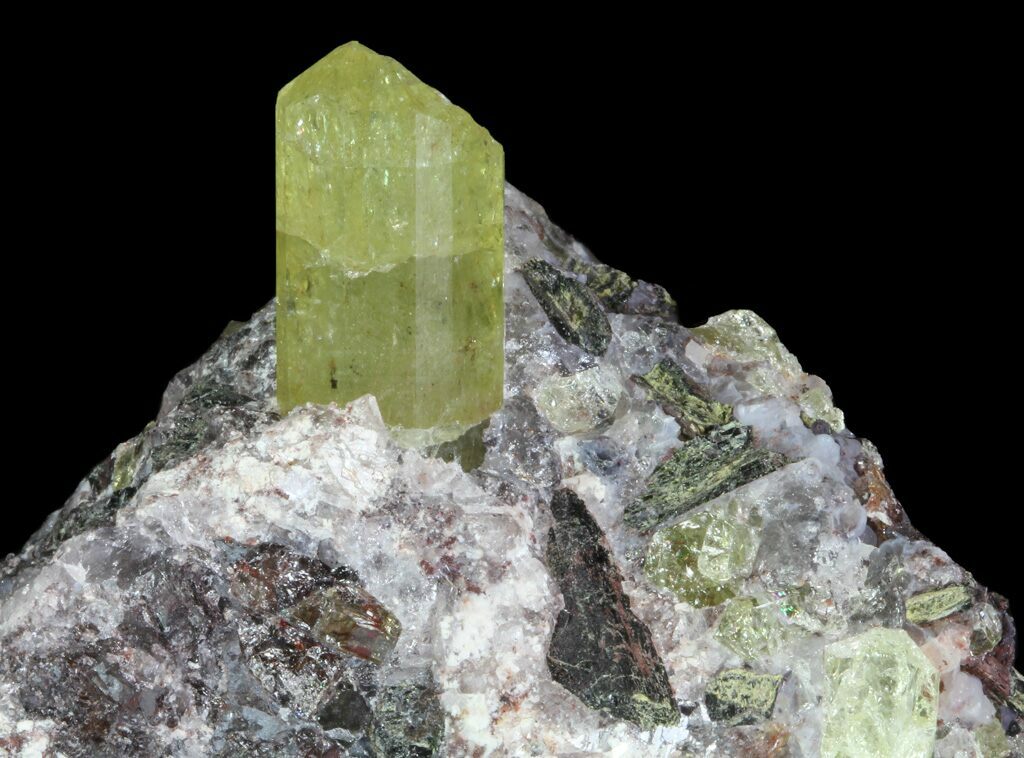 This is a lustrous, lemon yellow, apatite crystal still in matrix from Cerro del Mercado (Iron Mountain) at Durango, Mexico. One beautiful, transparent crystal can be found exposed on what could be considered the top of the specimen, including other crystal peering out from the matrix. The metallic mineralization on this specimen is magnetite, with small amounts of epidote peppered throughout the matrix.