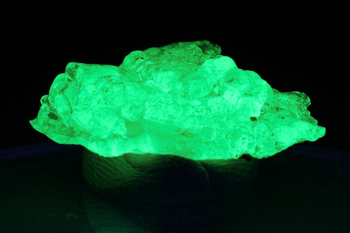 This is a gorgeous .9" wide hyalite opal specimen, collected from Erongo Region of Namibia. Under both longwave and shortwave UV light, the hyalite opal exhibits a vibrant green fluorescence. The reaction to shortwave UV is a result of trace uranyl ions.