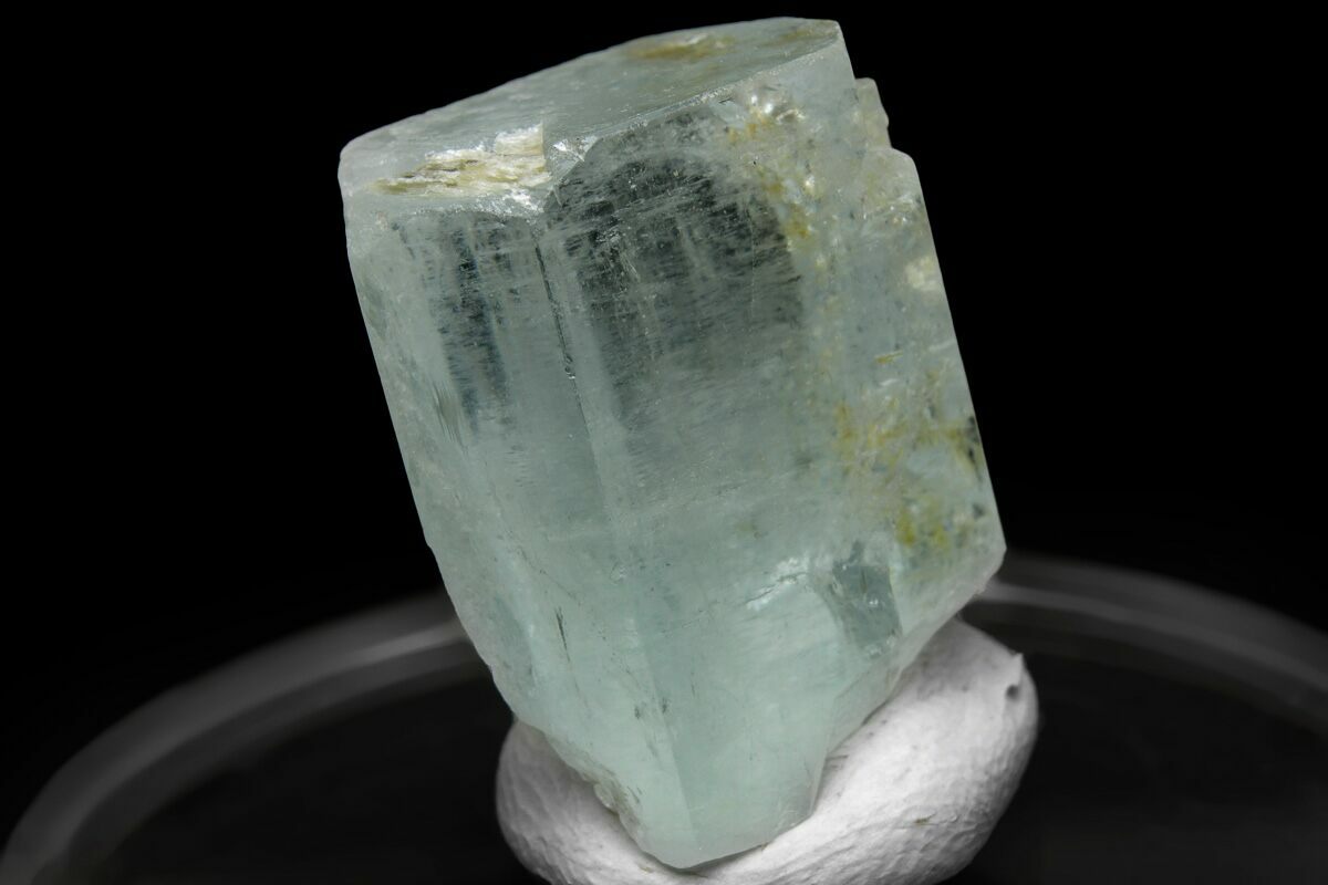 This is a beautiful, sky-blue aquamarine, collected from Baltistan, Pakistan, a location known for its aquamarine crystals. There is some damage to the crystal, however most of the crystal faces are intact. It has been mounted to an acrylic display base with mineral tack.