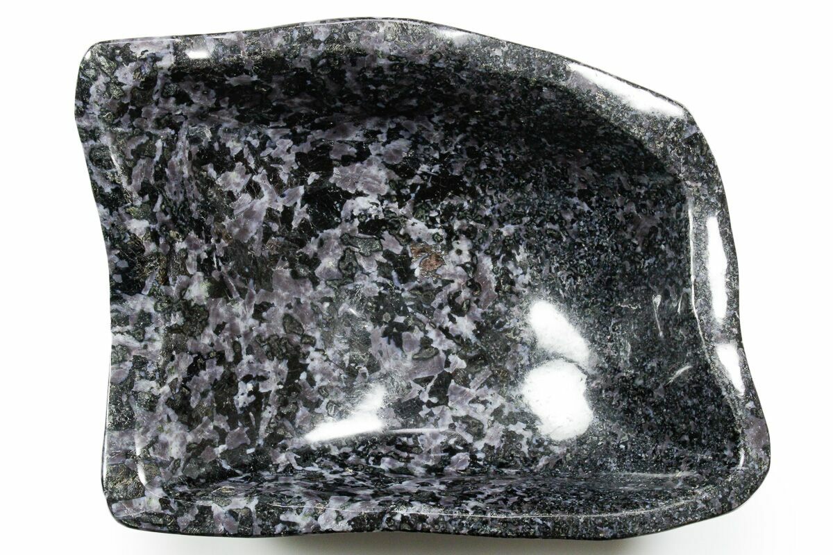This is a beautifully polished bowl that's formed from a section of indigo gabbro. It's polished to a glossy finish and proves that practicality and style can go hand in hand.