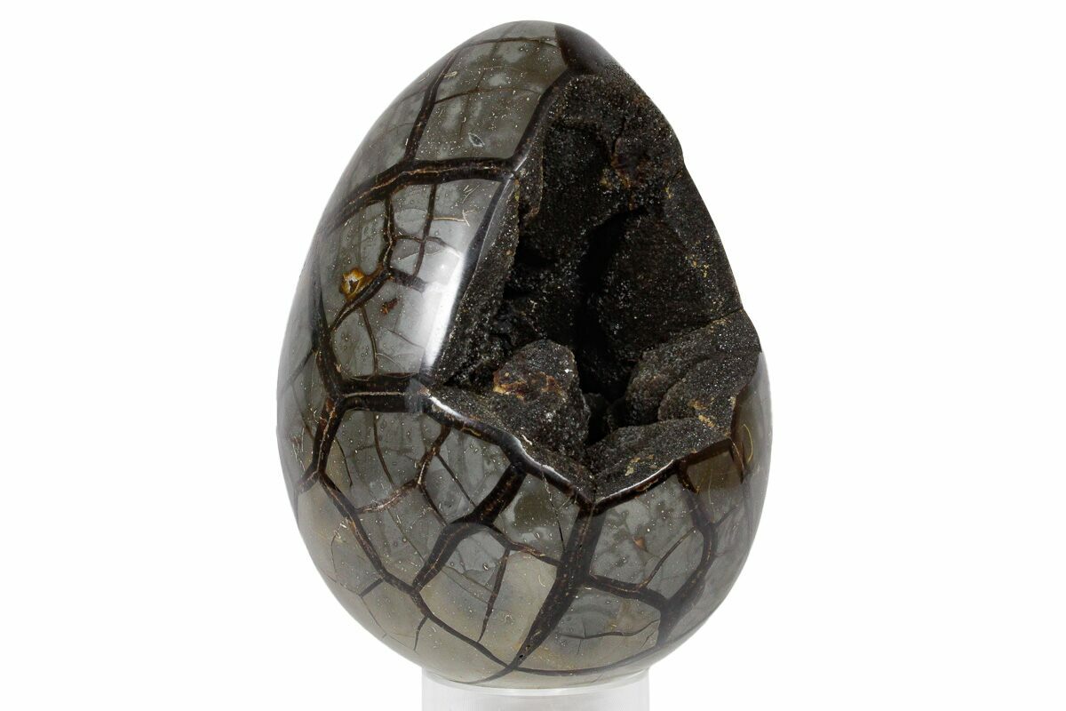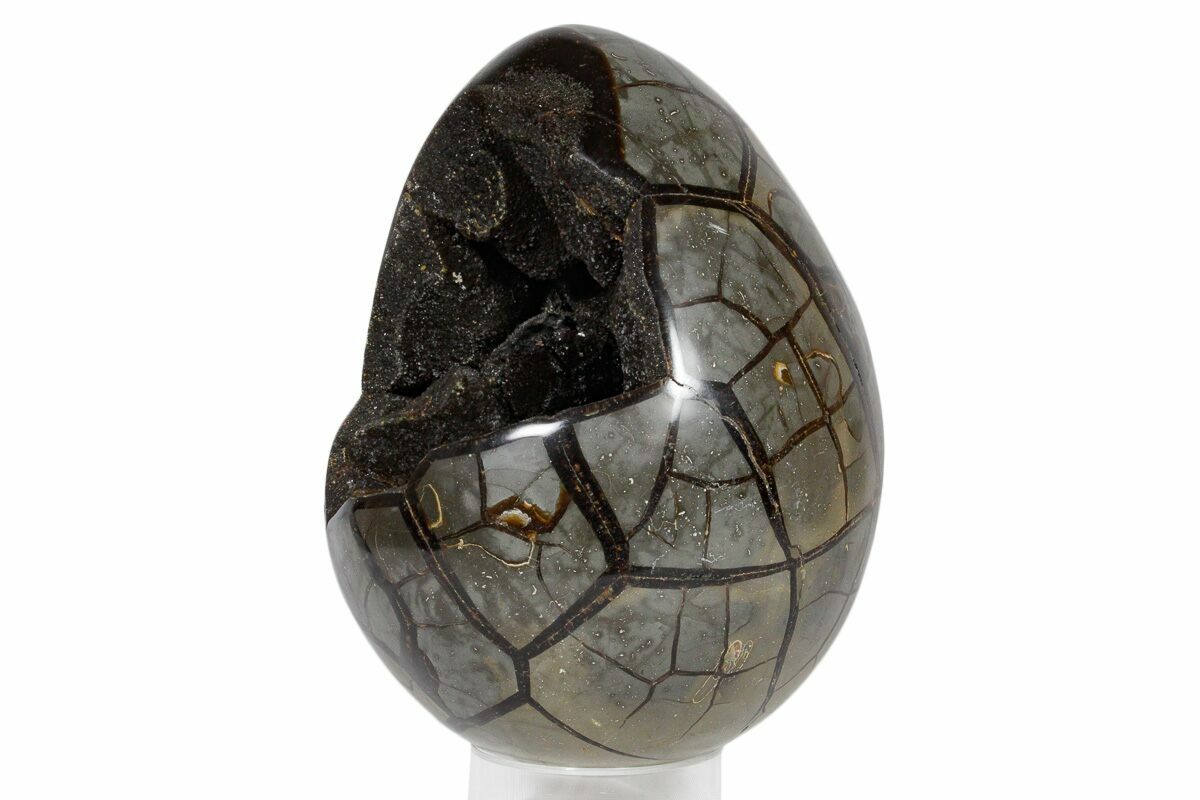 This is a gorgeous septarian "dragon egg" geode collected in the Betsiboka Region of Madagascar. The hollow cavity is full of beautiful, sparkling black & brown calcite crystals. It is a hollow septarian nodule which has been polished into an egg shape, and the natural cracked pattern of the septarian gives it the appearance of a dragons egg. A spectacular display piece which would look great in your home/office or make a great gift for the Game of Thrones enthusiast you know.