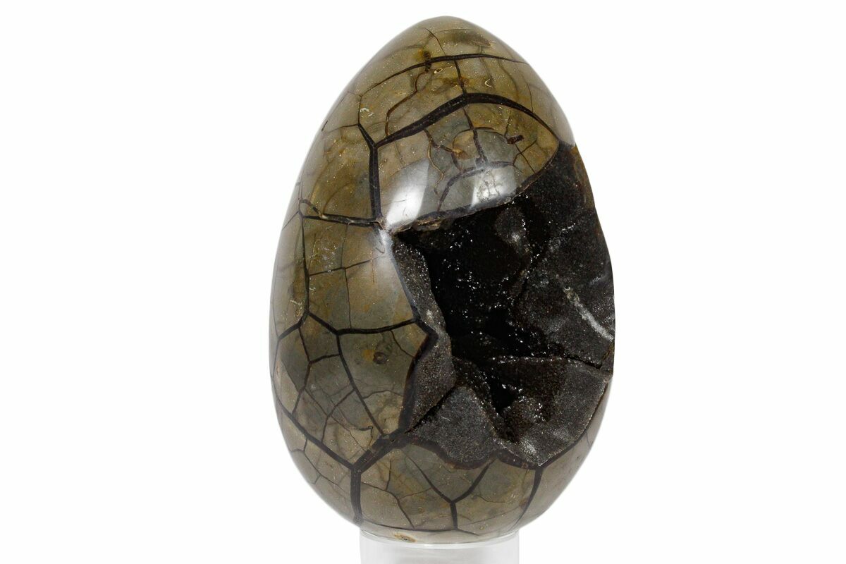 This is a gorgeous septarian "dragon egg" geode collected in the Betsiboka Region of Madagascar. The hollow cavity is full of beautiful, sparkling black & brown calcite crystals. It is a hollow septarian nodule which has been polished into an egg shape, and the natural cracked pattern of the septarian gives it the appearance of a dragons egg. A spectacular display piece which would look great in your home/office or make a great gift for the Game of Thrones enthusiast you know.