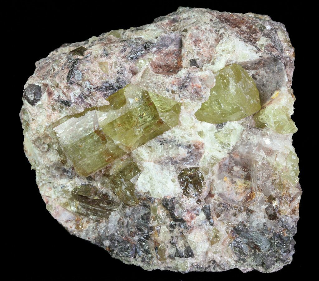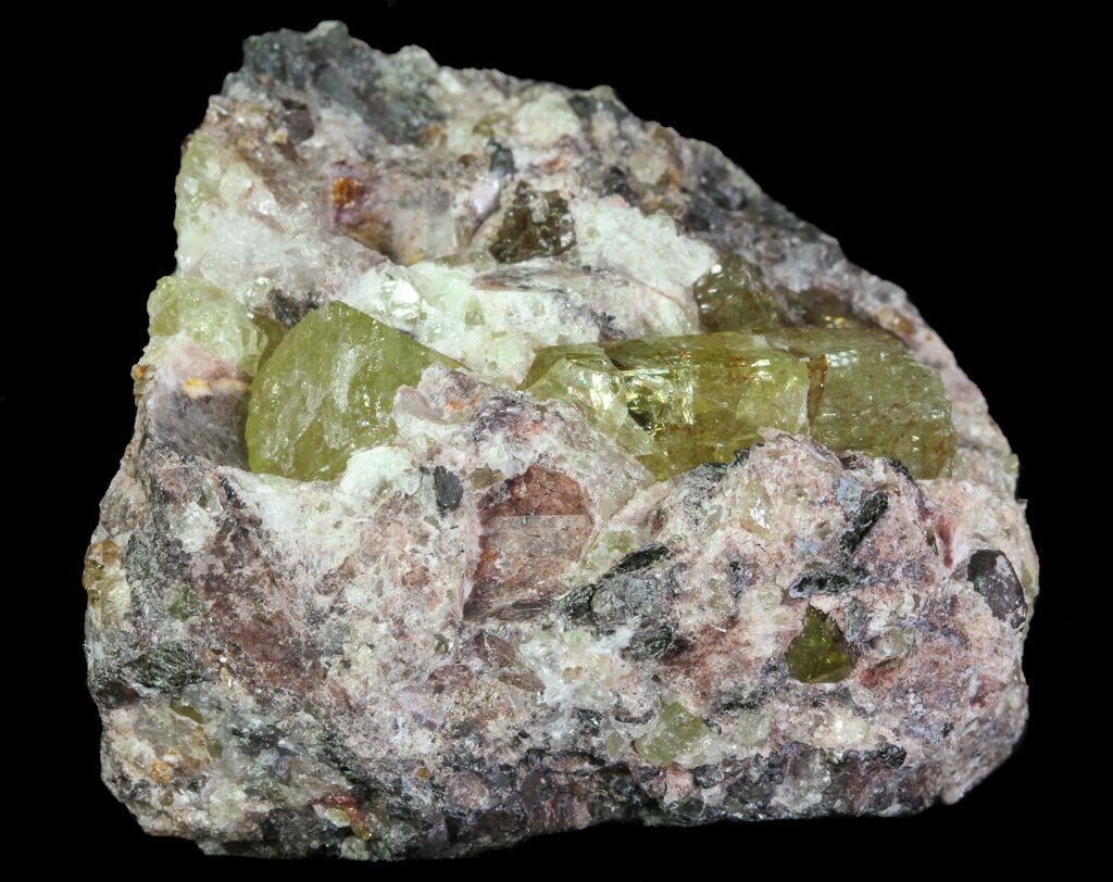 This is a lustrous, lemon yellow, apatite crystal still in matrix from Cerro del Mercado (Iron Mountain) at Durango, Mexico. Two definite, transparent crystals can be found exposed on what could be considered the top of the specimen. The metallic mineralization on this specimen is magnetite, making up for the majority of the matrix.