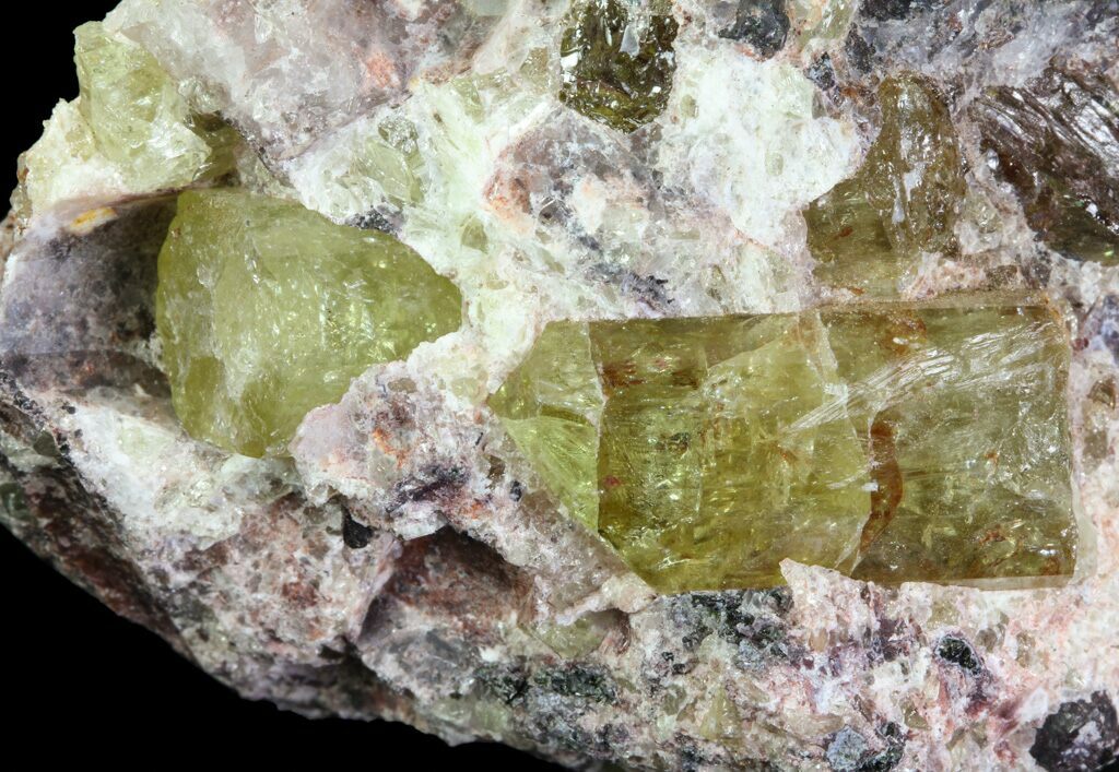 The bright, lustrous apatite crystals form hexagonal shapes with off-center terminations. They are found in vugs, often associated with quartz and calcite. Most crystals are around an inch in length, though larger crystals up to about 4 inches long have been found.