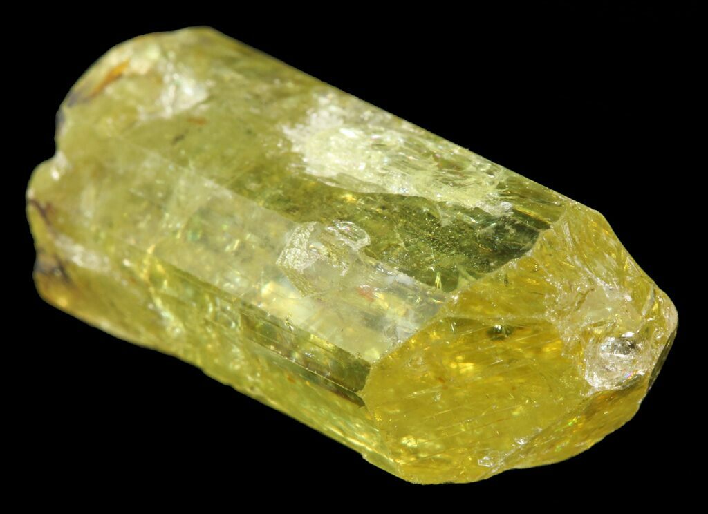 This is a mountain-dew green/yellow, apatite crystal from Cerro del Mercado (Iron Mountain) at Durango, Mexico. It's completely free of the matrix and has a small amount of hematite still attached. It has some minor chips throughout the crystal, as well as a missing chip from the termination.