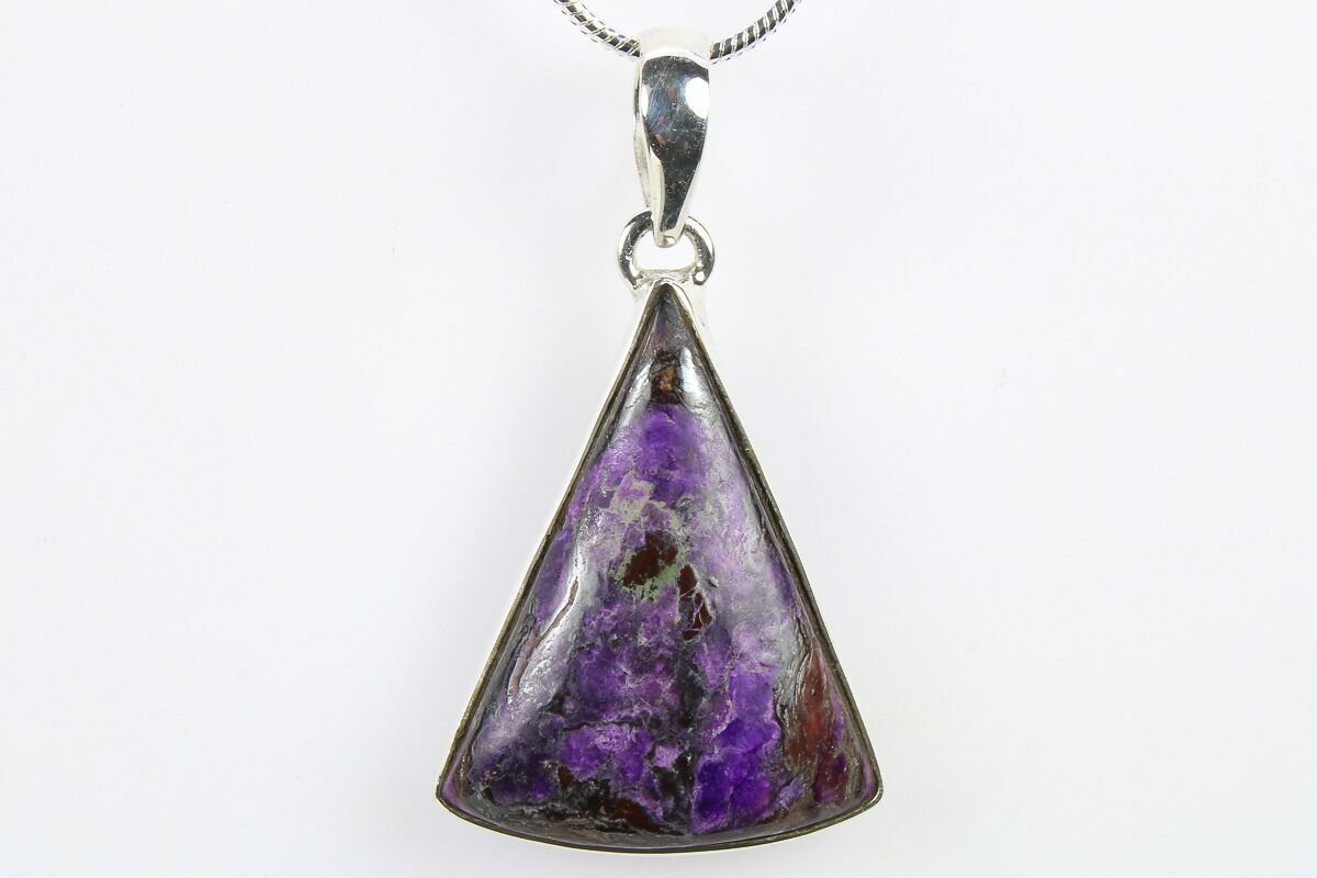 This is an eye catching, sugilite pendant featuring a polished sugilite stone set in 925 sterling silver. The pendant itself is .95" tall (not including loop). A 20" silver plated snake chain with a lobster clasp is included with the pendant. You will receive the exact pendant pictured.