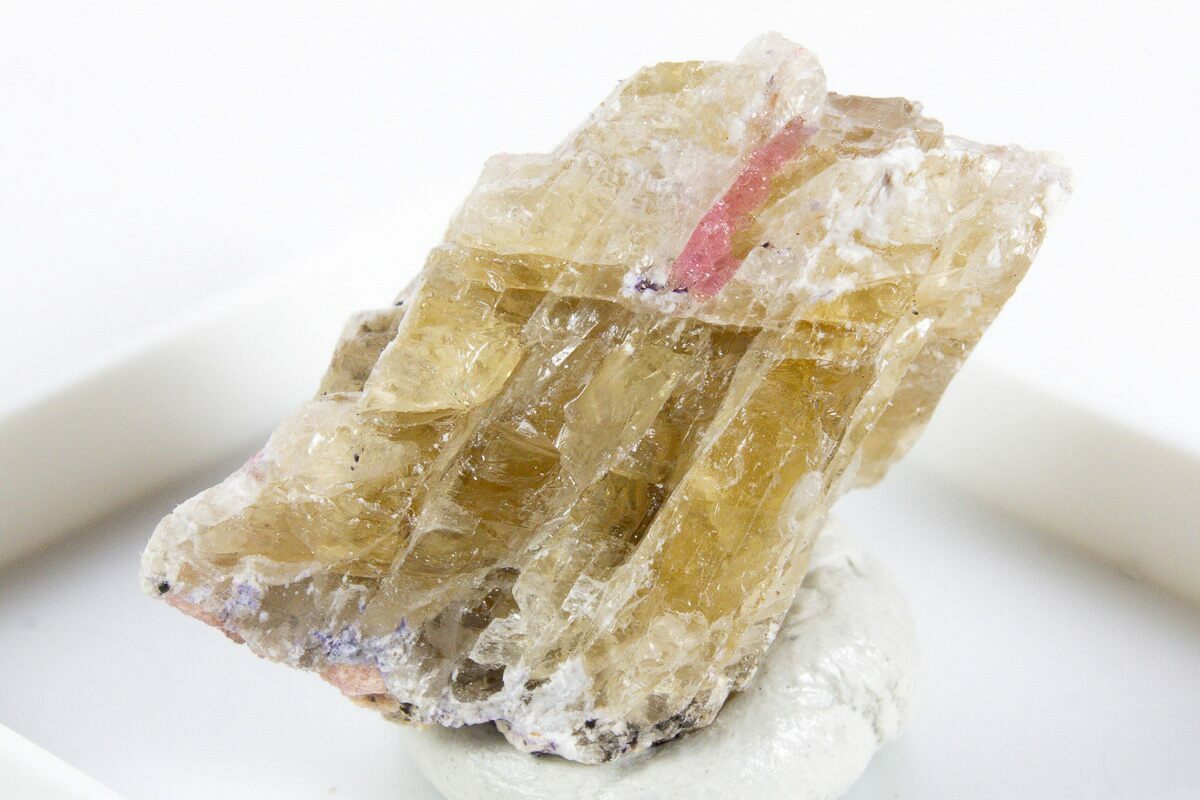 This beautiful .95" wide specimen features transparent yellow-gray vlasovite with spots of pink eudialyte and white gittinsite. This material comes out of the Kipawa alkaline complex in Québec, Canada.