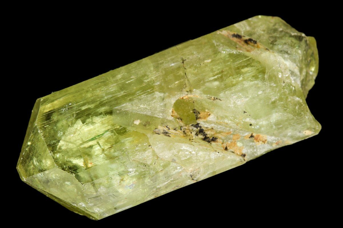 Apatite is the name given to a generic group of isomorphous hexagonal phosphate minerals. Its name comes from the Greek word apatite, which means 'to deceive': this is because apatite often resembles other common hexagonal-habit minerals. Their bright, lustrous crystals are often found in vugs (small cavities in rock) associated with quartz and calcite. Many crystals are around an inch in length, though larger crystals up to about 4 inches long have been found.
