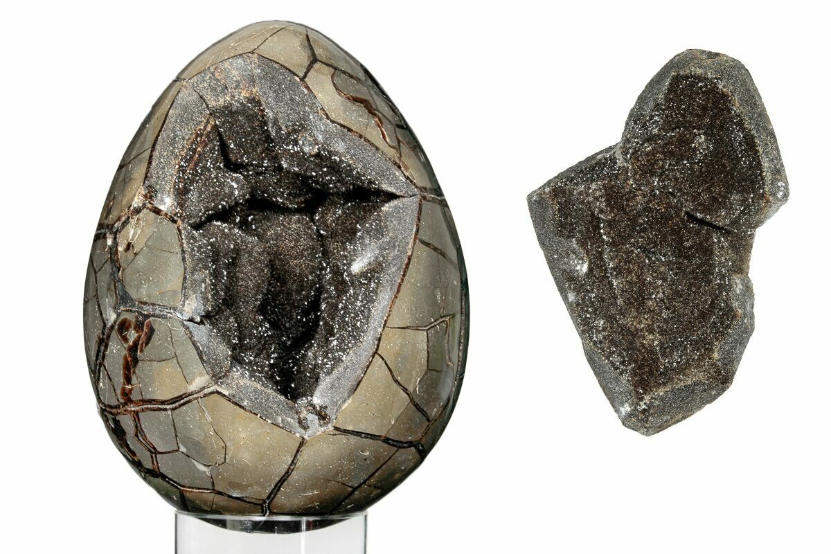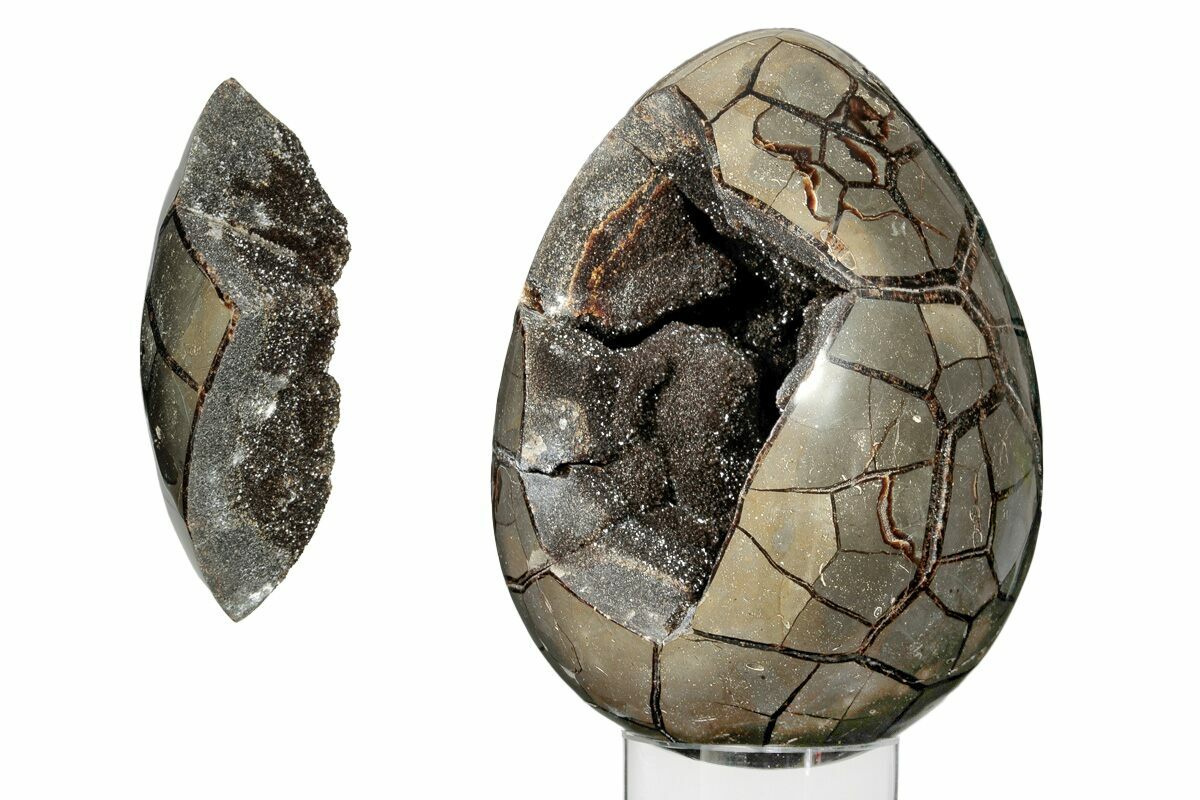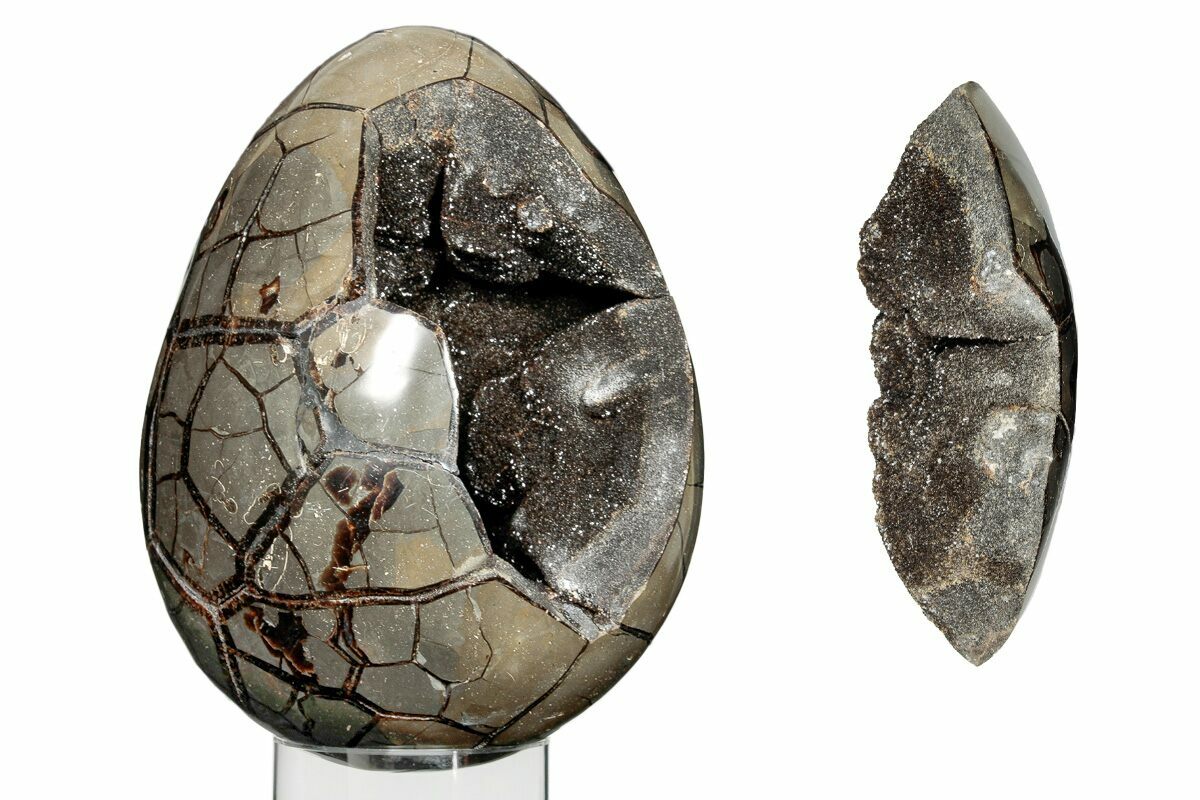 This is a polished septarian geode collected from the Betsiboka Region of Madagascar. The hollow cavity is full of shimmering, black calcite crystals and the exterior has been shaped and polished into the shape of an egg with a glossy finish. A removable "puzzle piece" allows the interior, crystal filled cavity to be viewed.