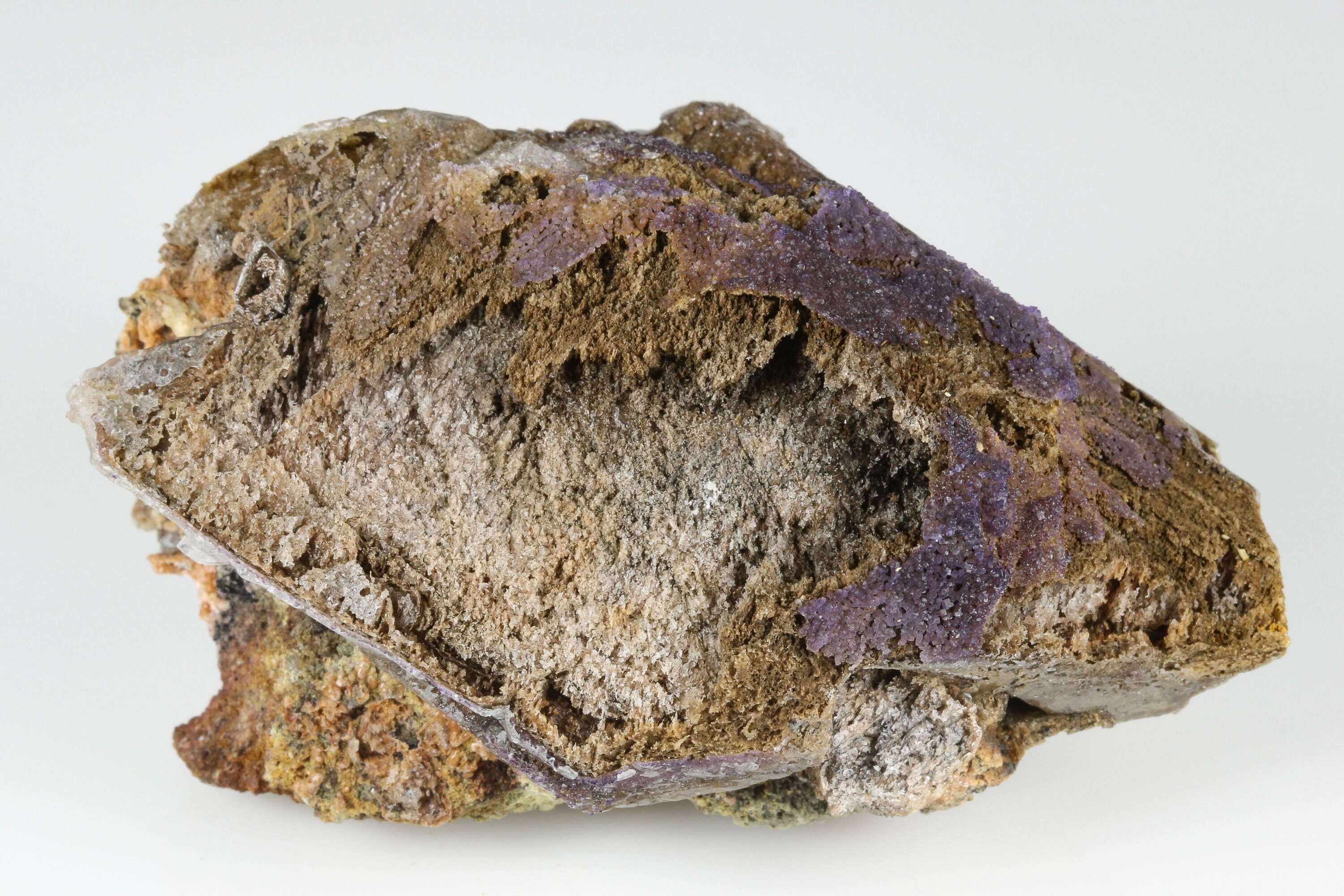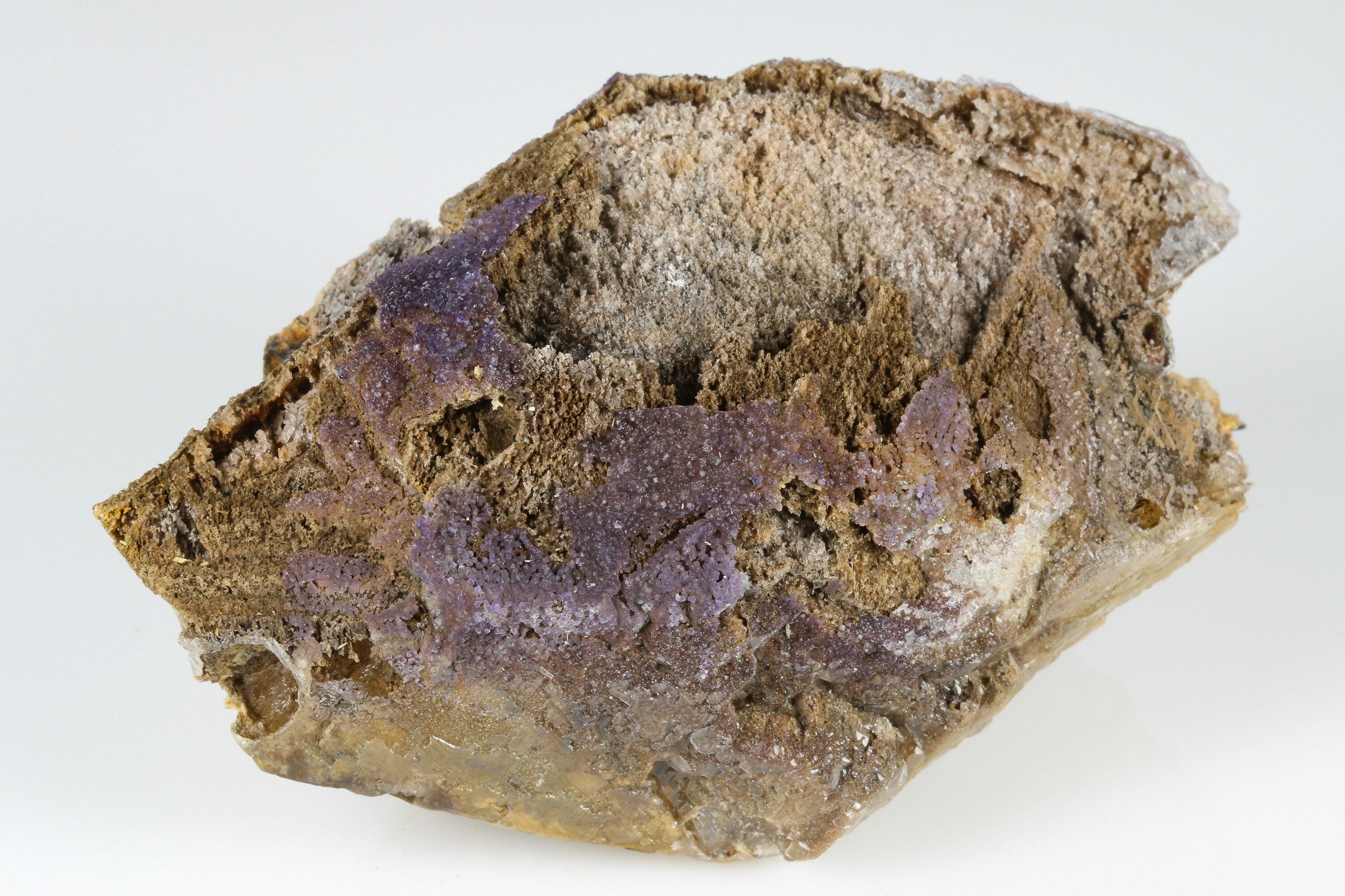 This is an interesting, 3.5" wide calcite crystal that is part of a new find in Qinglong, China. The scalenohedral calcite crystal naturally deteriorated, however small amounts of cubic, purple fluorite still encrust the calcite. It is claimed that this fluorite is Yttrofluorite (fluorite containing an appreciable amount of the rare earth element yttrium), but we have not been able to independently verify this.