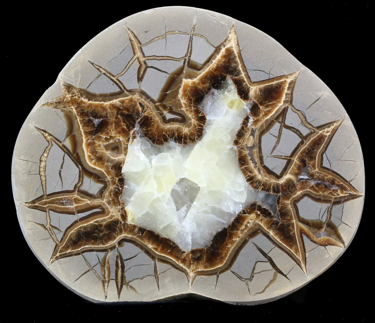 This is a beautiful, polished slice from a septarian nodule. This septarian was mined West of Orderville, Utah and was deposited during the Late Cretaceous, about 100 million years ago. The contrast between the grey limestone and white Calcite crystals and brown Aragonite is quite stunning. It's been polished on one side and displays well on the included display stand.