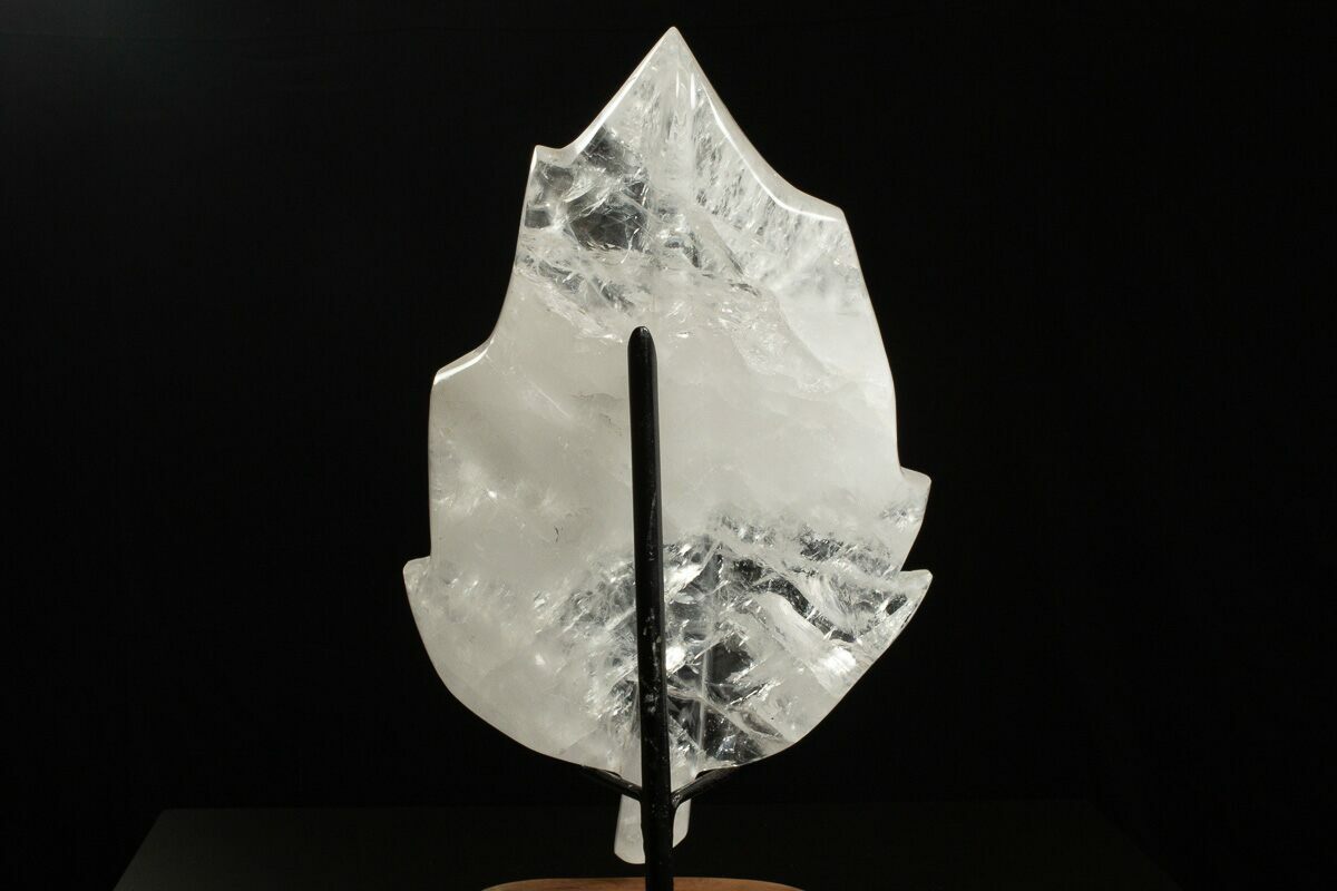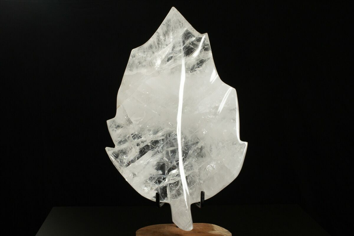 This is an absolutely beautiful hand polished leaf made from quartz collected in Madagascar. It measures 10.9" long and has been sculpted into the shape of a leaf. It sits upright beautifully on the accompanied metal and wood display stand.