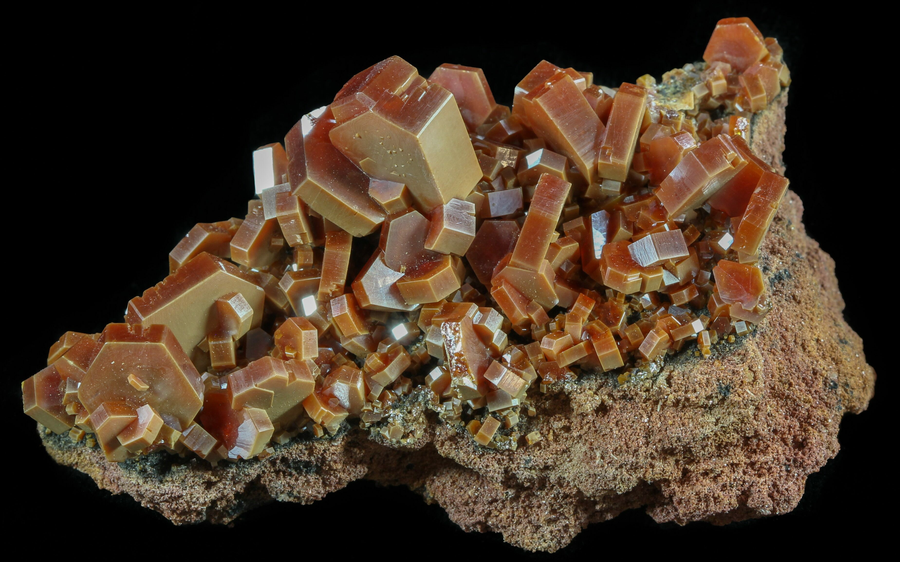 This is a beautiful aggregation of large deep red and light brown, vanadinite crystals from Midelt, Morocco. They exhibit excellent color saturation, and a mirror luster on an iron-rich matrix. This specimen is a cluster of hundreds of both small and large, high quality crystals.