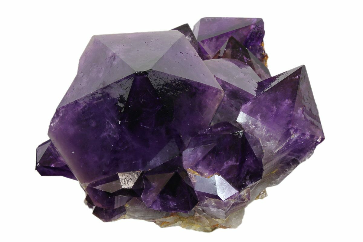 Amethyst clusters from the Democratic Republic of the Congo are renowned for their exceptionally dark, saturated purple color and their impressively large, well-formed crystals. Many Congolese clusters display deep violet to almost inky tones, often with excellent luster and sharp crystal terminations. Compared to amethyst from other localities, Congo material tends to have thicker, more robust crystal points that grow densely together, giving these clusters a bold, architectural presence that is especially prized for display.