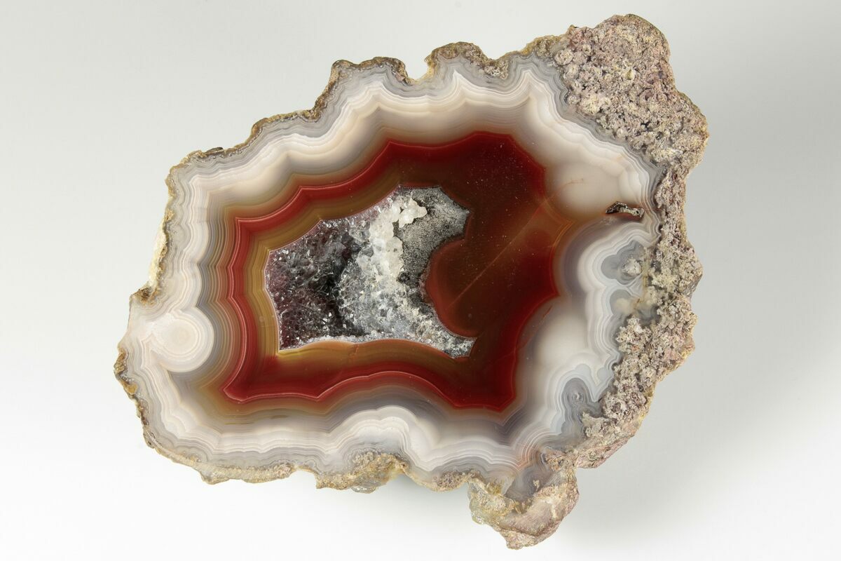 Laguna agate is a highly sought after variety of banded chalcedony. It often forms in bands of red, pink, white, and scarlet hues, and some specimens even contain bands of brown and golden yellow chalcedony. The first documented finds of this agate occurred in the late 1940s: since then, these agates have been extracted from several sites near Ojo Laguna, Chihuahua, Mexico. They are roughly 38 million years old.