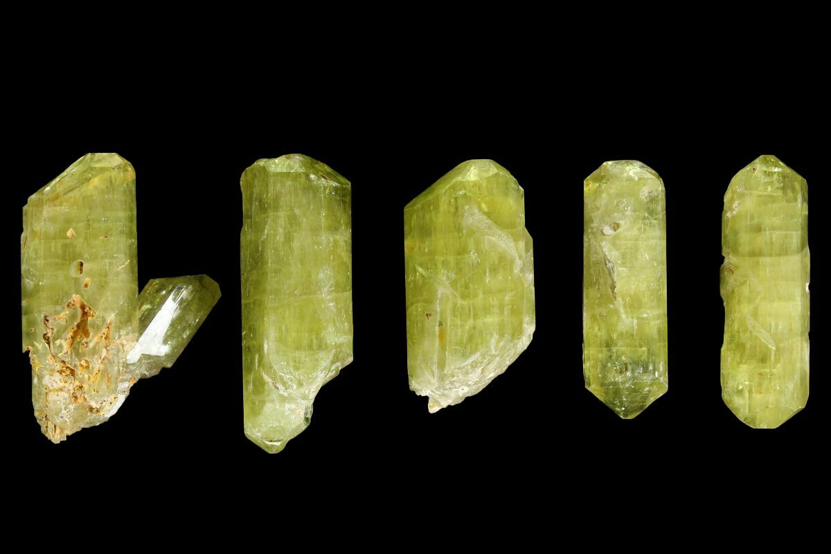 This is a bag of 5 high quality, greenish-yellow apatite crystals with good terminations, collected from Imilchil, Morocco. You will receive the 5 crystals that are pictured above, each of which is over 1.4" in length.