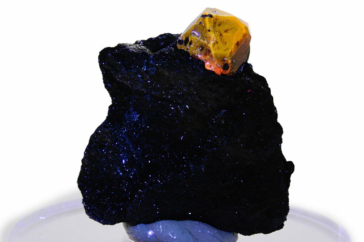 This beautiful specimen features a deep red-brown zircon crystal that's still partially embedded in the biotite (mica schist) matrix it formed within. It was collected from Finnmark, Norway and the crystal measures .46" wide. Under short-wave UV the zircon fluoresces a stunning yellow color! A photo of this specimen under short-wave UV can be seen above.