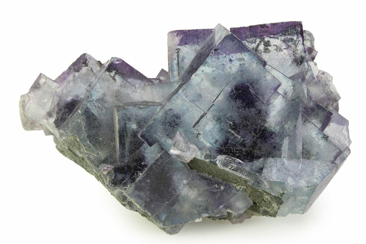 This is a spectacular, 2.8" wide cluster of cubic fluorite crystals bearing a mixture of purple, blue, and green coloration along with exceptional clarity. It was collected from the Yaogangxian Mine in the Hunan Province of China, a site known to produce some of the most alluring fluorite specimens. Under short-wave ultraviolet light, the crystals exhibit a purple fluorescence.