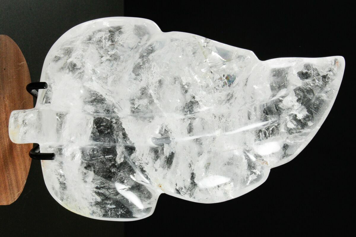 This is an absolutely beautiful hand polished leaf made from quartz collected in Madagascar. It measures 8.1" long, has been sculpted into the shape of a leaf, and much of the quartz exhibits excellent clarity. It sits upright beautifully on the accompanied metal and wood display stand.