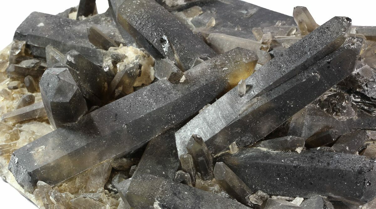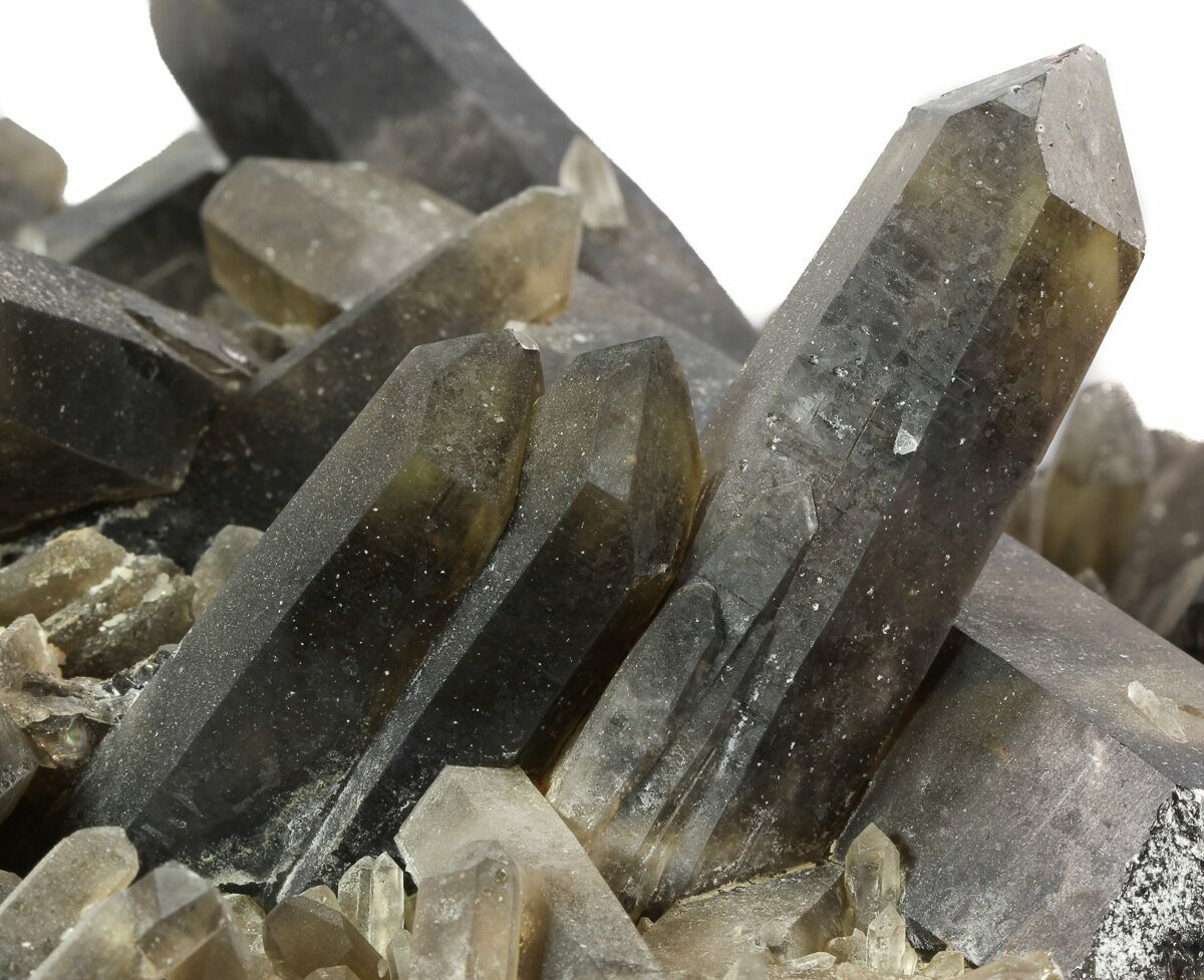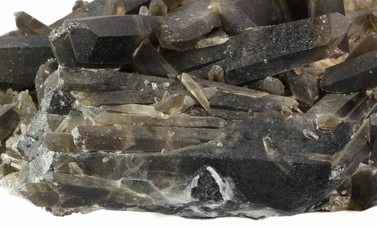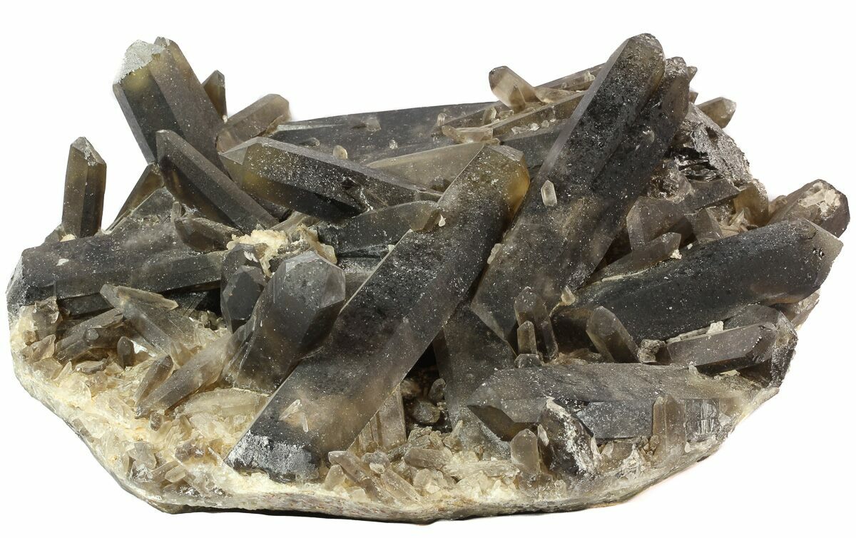 This is a large cluster of dark black, smoky quartz crystals from Brazil. The entire plate is 11.6 inches wide and the longest point is over 5 inches long. The crystals on the specimen are quite large, just about all of which are chip free. The smoky-black coloration goes all the way down to the granite matrix. It has not been heated or treated to change the natural color.