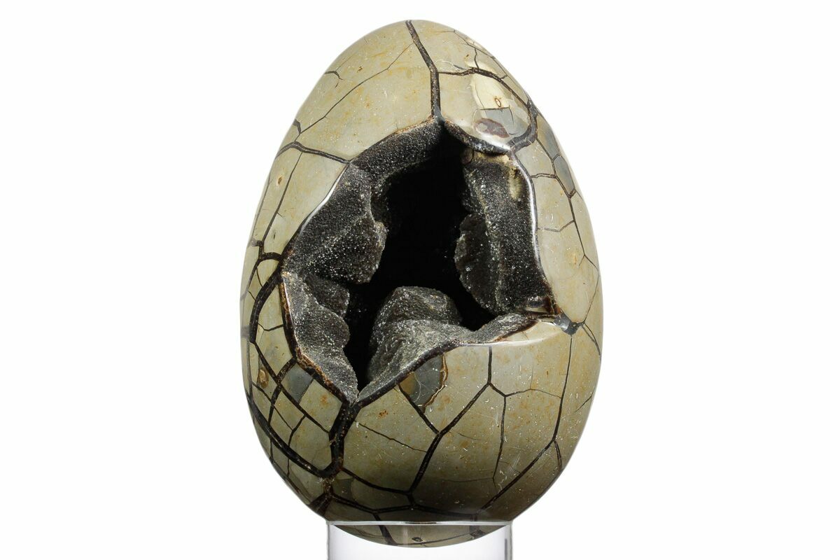 This is a gorgeous septarian "dragon egg" geode collected in the Betsiboka Region of Madagascar. The hollow cavity is full of beautiful, sparkling black and brown calcite crystals It is a hollow septarian nodule which has been polished into an egg shape, and the natural cracked pattern of the septarian gives it the appearance of a dragons egg. A spectacular display piece which would look great in your home/office or make a great gift for the Game of Thrones enthusiast you know.