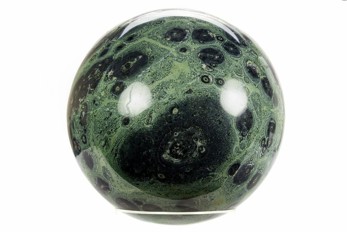 This is a beautiful hand polished sphere made from kambaba jasper found in Madagascar. It is 6.8" wide and has dark circular mineral formations throughout the green matrix.
