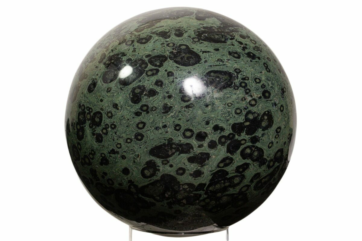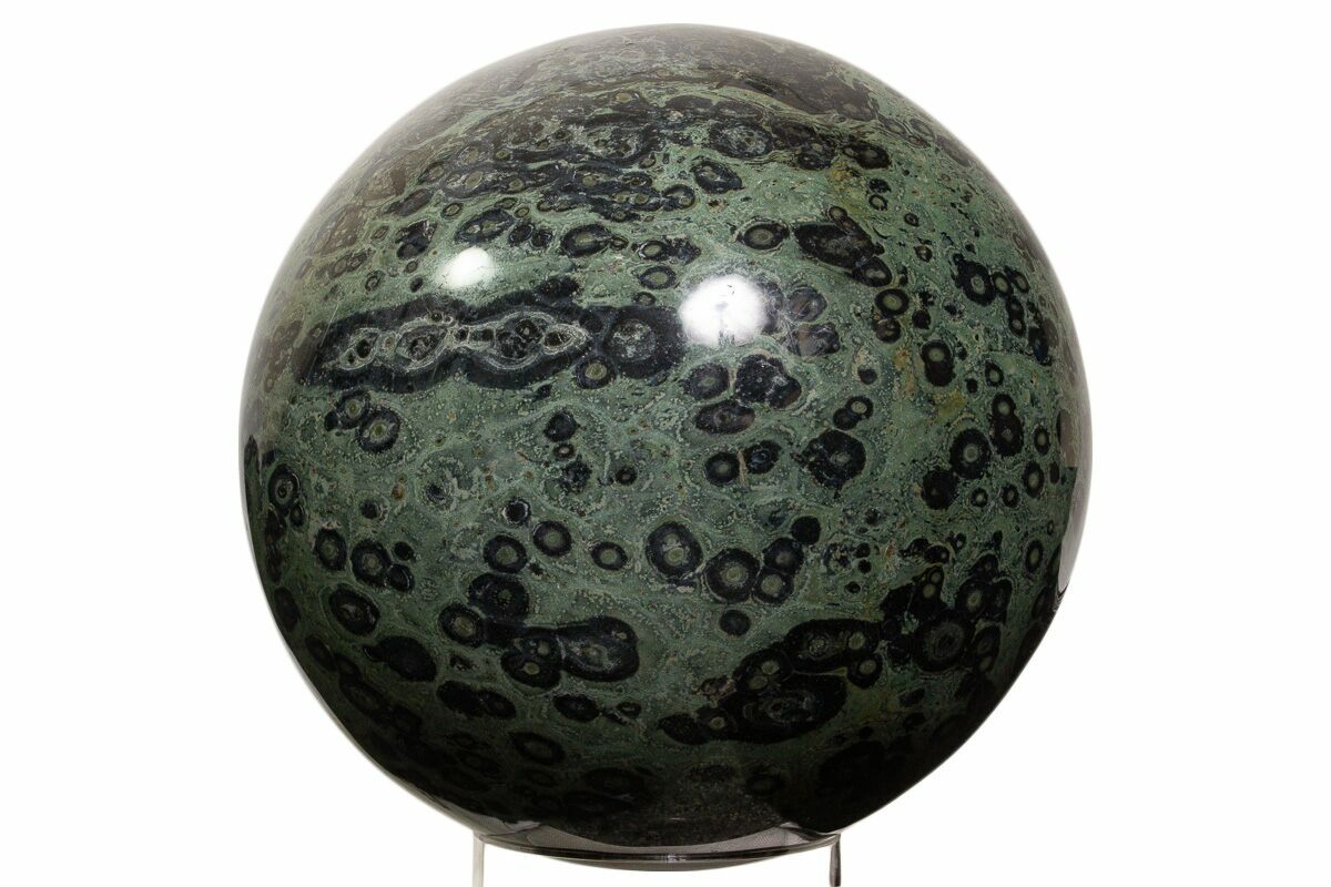 This is a beautiful hand polished sphere made from kambaba jasper found in Madagascar. It is 8.8" wide and has dark circular mineral formations throughout the green matrix.