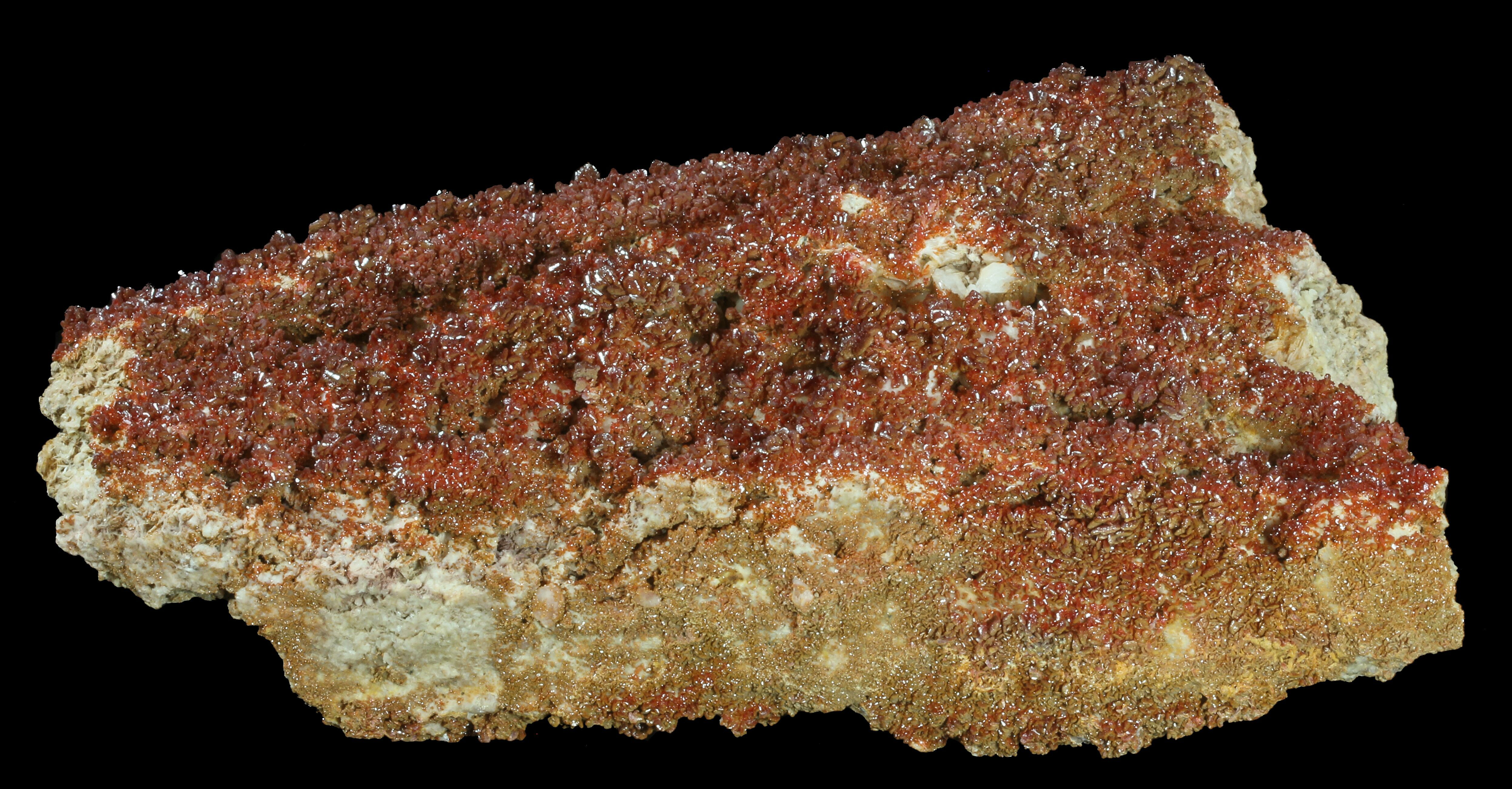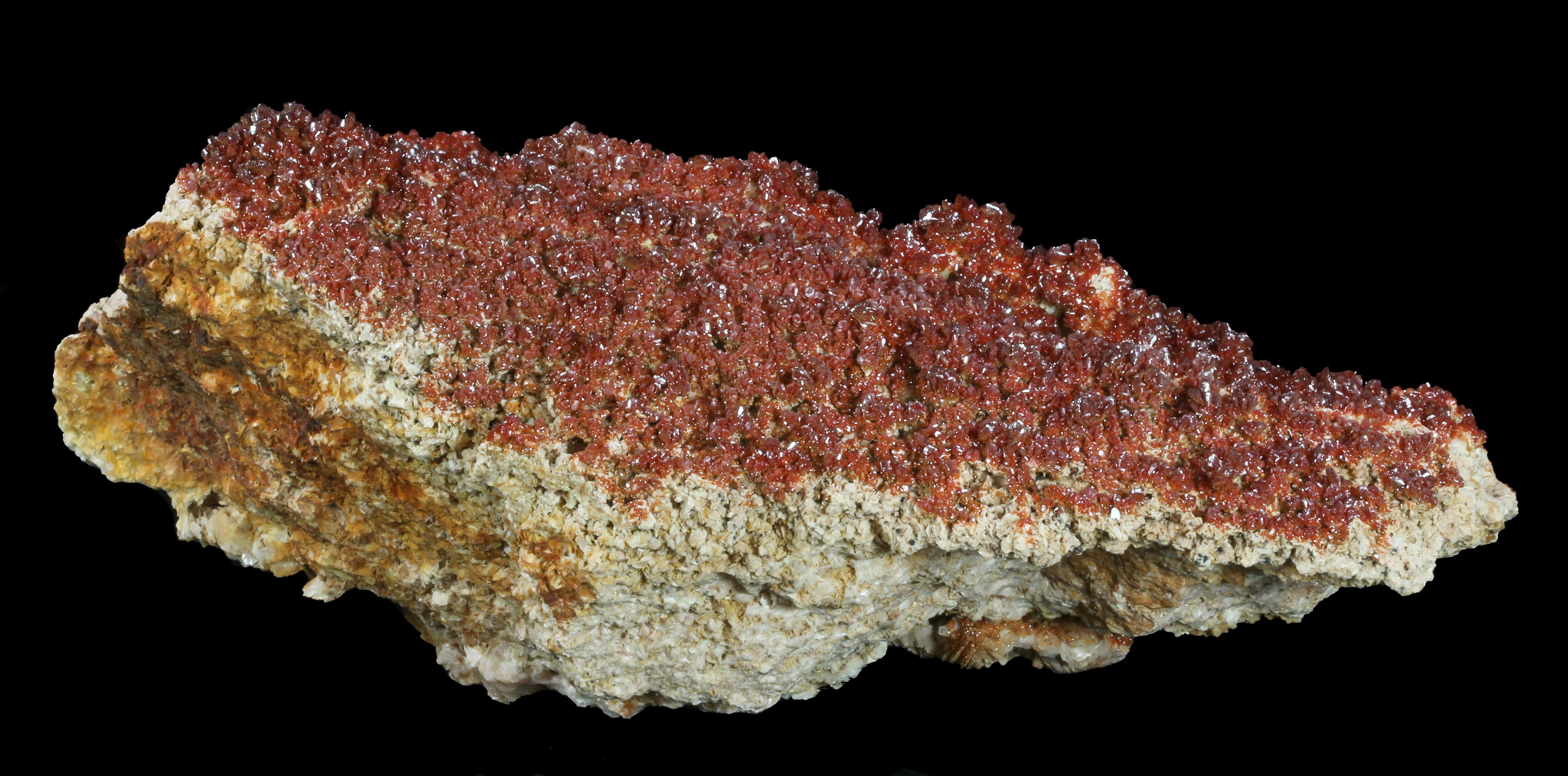 This is a huge plate, of sparkling, ruby-red Vanadinite crystals on a pink, bladed barite matrix from Mibladen, Morocco. This stunning piece is an impressive 11" wide.