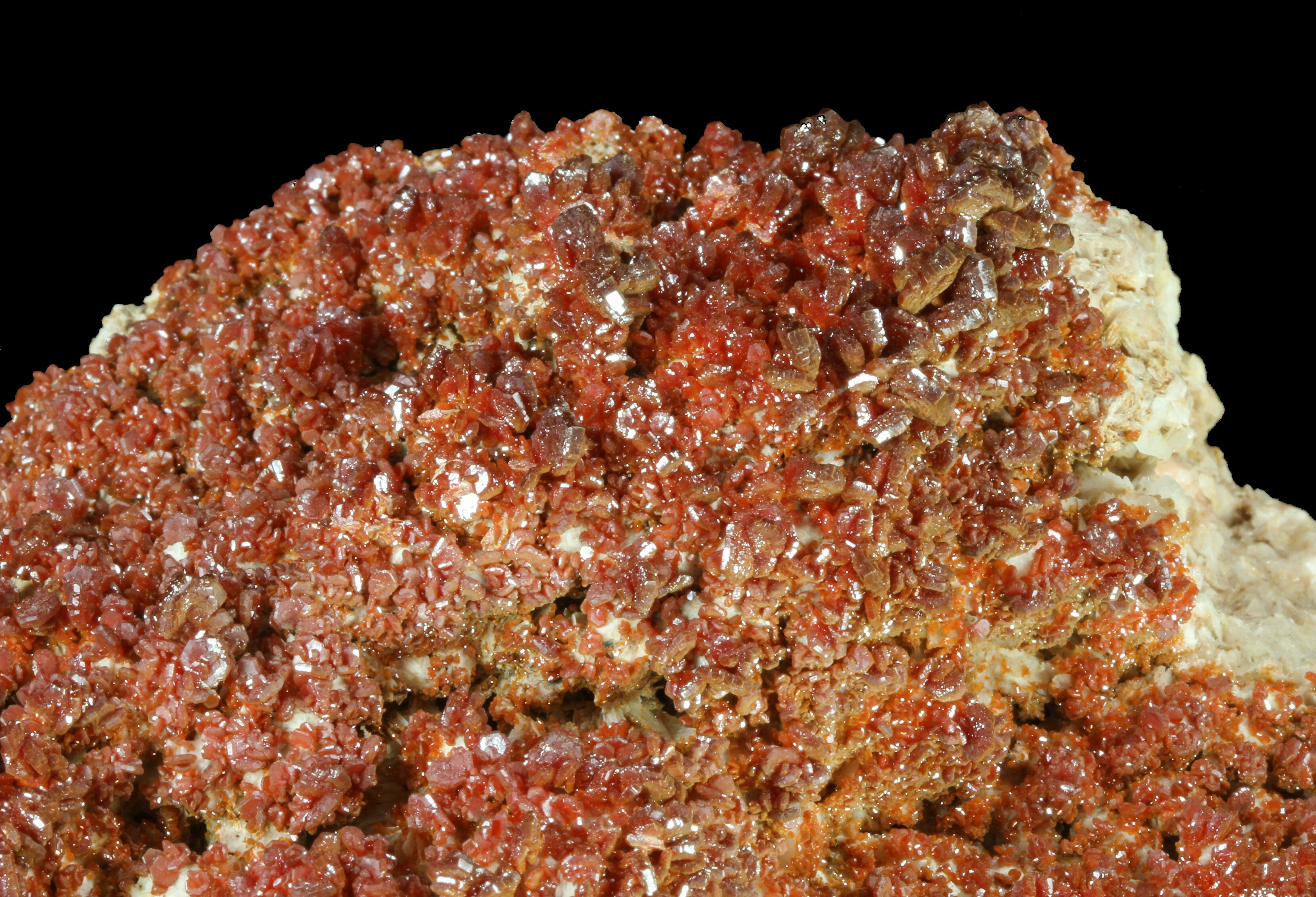Vanadinite from Morocco is world-famous for producing some of the finest red crystal specimens on the planet. In the arid hills surrounding Mibladen and Taouz, vanadinite forms as vibrant clusters of hexagonal prisms, often with a deep crimson to orange-red color that seems to glow against the pale desert matrix. These crystals typically develop in dense groups, coating barite blades or covering weathered limestone with dazzling, glassy faces and sharp geometric symmetry. The dryness of the region and the slow oxidation of ancient lead deposits create the perfect geochemical environment for vanadinite to grow with exceptional clarity, luster, and intensity of color. Moroccan vanadinite is highly prized by collectors for its bold aesthetics, architectural crystal formations, and the consistent quality that has made these localities the global benchmark for the species.