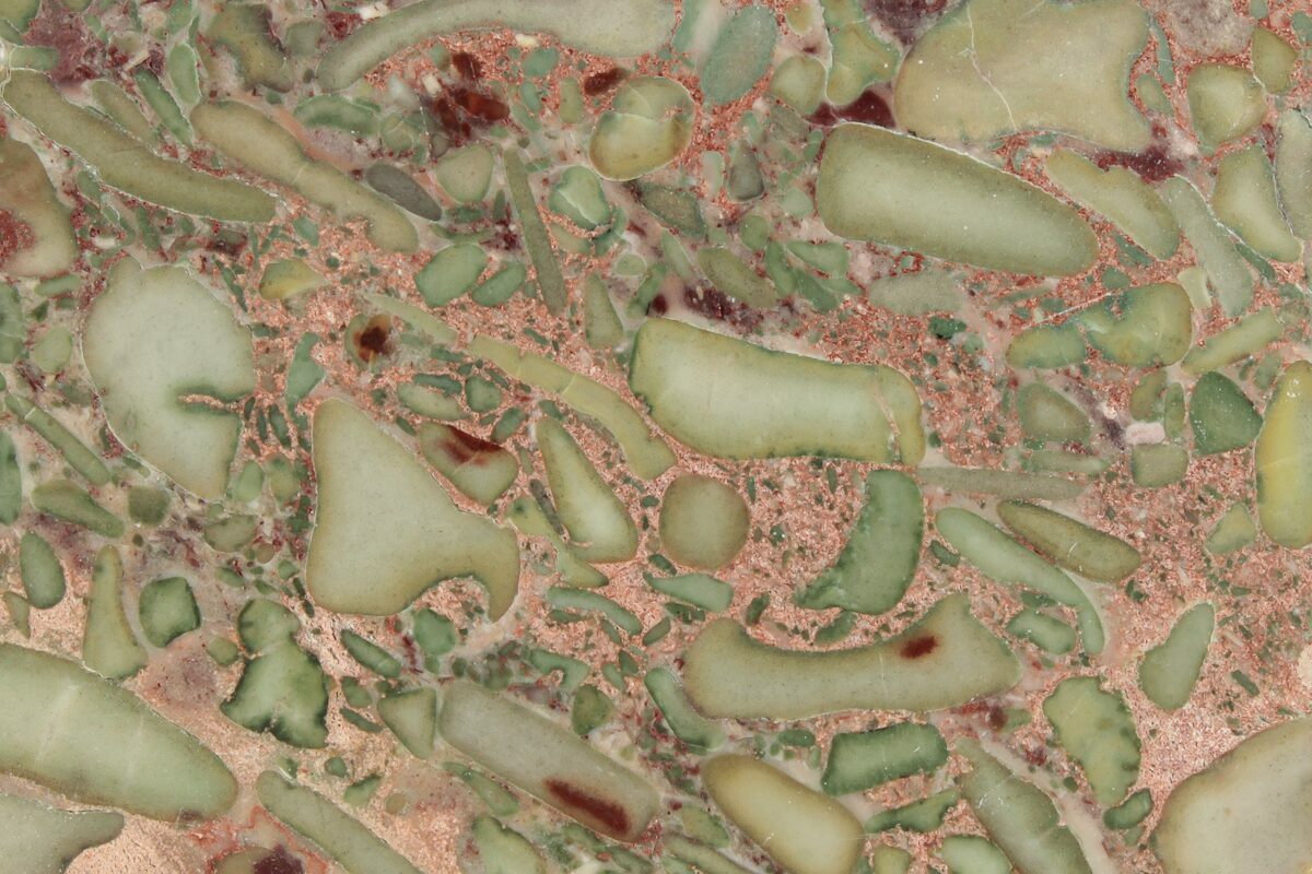 This vibrant piece of Fruit Jasper—also known as Ajooba Jasper or Sabalgarh Marble—features a striking mosaic of red, yellow, green, khaki, and brown nodules set within a warm buff-to-beige matrix. Its lively, “fruit-mix” appearance comes from clusters of rounded inclusions that resemble pistachios or berries embedded in stone—and in many cases, these nodules actually contain tiny fossil fragments such as crinoid stem pieces and other bioclastic debris from the ancient seafloor. These remnants of marine life add an unexpected paleontological twist to the stone’s already eye-catching patterning, making each piece even more visually unique.