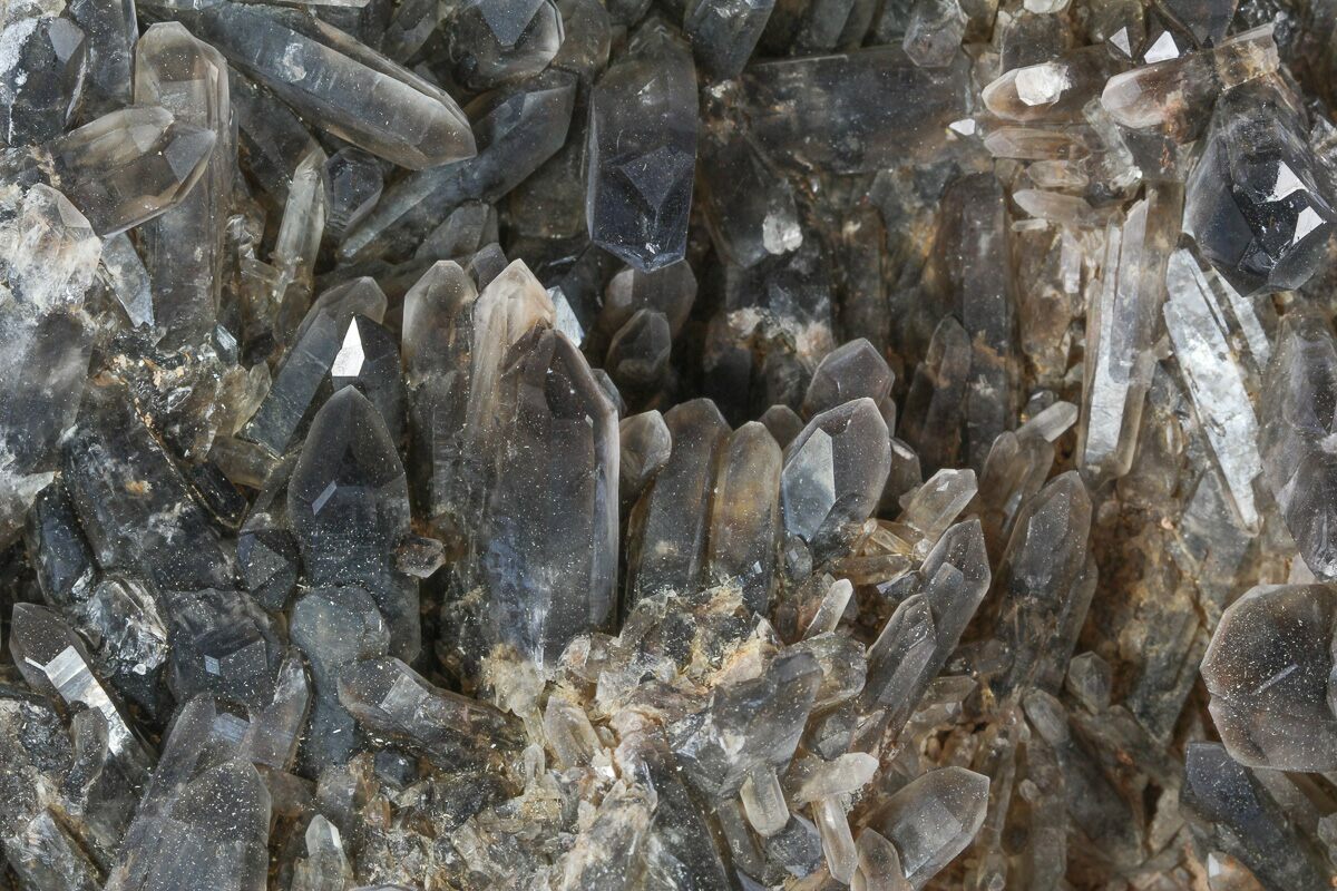 This is a large cluster of dark black, smoky quartz crystals from Brazil. The entire plate is 11.6 inches wide and the longest point is just over 2 inches long. The crystals on the specimen are relatively small, however, nearly all of the crystals are damage free and have beautiful smokey coloration. It has not been heated or treated to change the natural color.