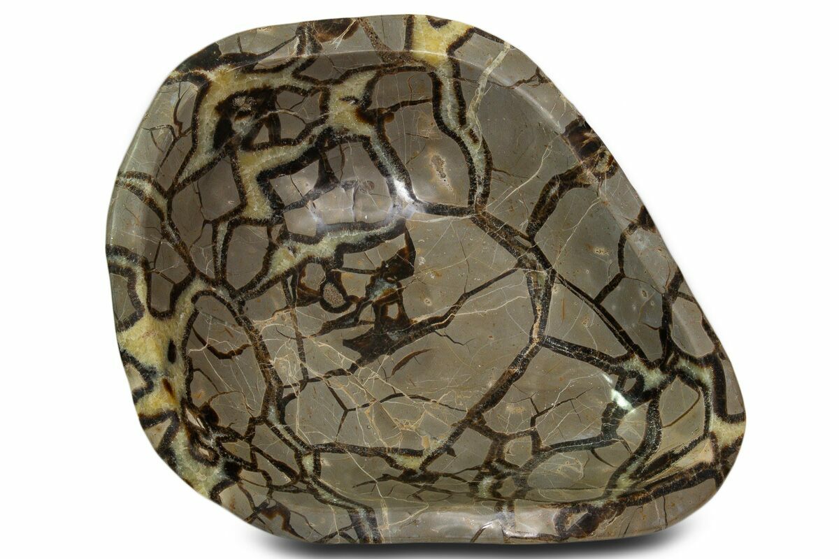 This is a large, 13" wide bowl carved from septarian. The septarian comes from the Betsiboka Region of Madagascar and was deposited during the Jurassic period. The base of the bowl has been cut flat.