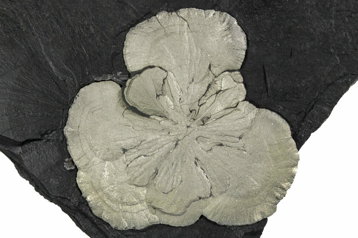 People used to believe that pyrite suns were fossils that had undergone pyrite replacement. The current consensus is that they are simply formed due to the enormous pressure compacting the slate, and causing pyrite to grow laterally in a radiating manner.