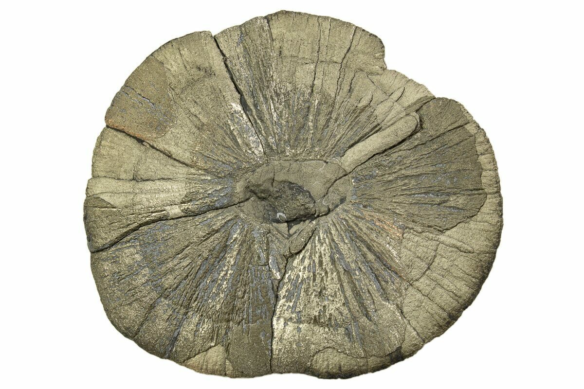 Pyrite suns or pyrite dollars are an unusual pyrite formation: striations radiate out from the center like rays of the sun. They are found in narrow, compacted seams of slate interbedded in the 300 million-year-old coal deposits near Sparta, Illinois. They are recovered as a byproduct of local coal mining operations, but are increasingly difficult to source as the coal mines in Illinois shut down one by one.