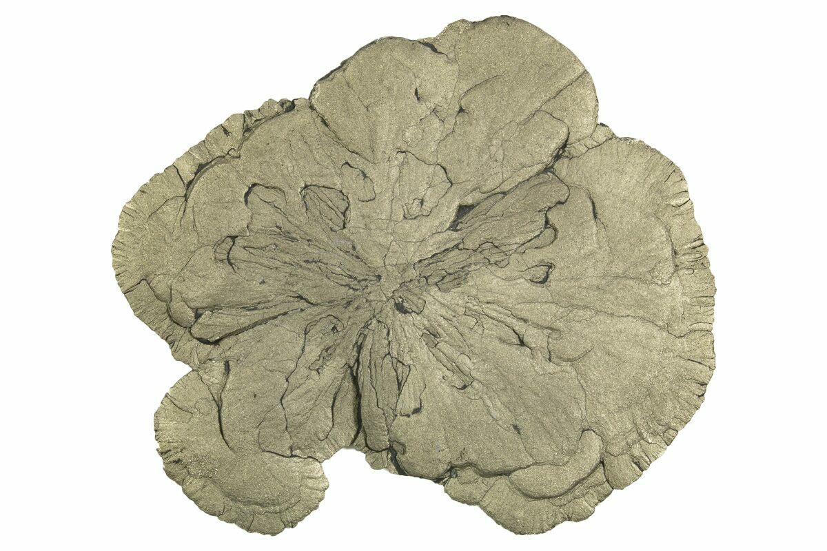 People used to believe that pyrite suns were fossils that had undergone pyrite replacement. The current consensus is that they are simply formed due to the enormous pressure compacting the slate, and causing pyrite to grow laterally in a radiating manner.